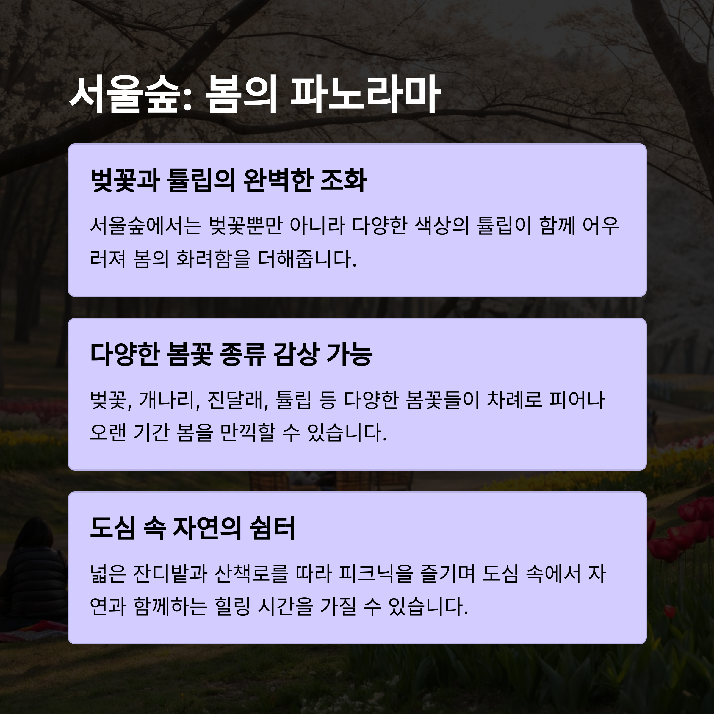 서울숲에서는 벚꽃 외에 튤립 등 다양한 봄꽃을 함께 감상할 수 있어 가족 단위 관람객에게 특히 인기가 많습니다.