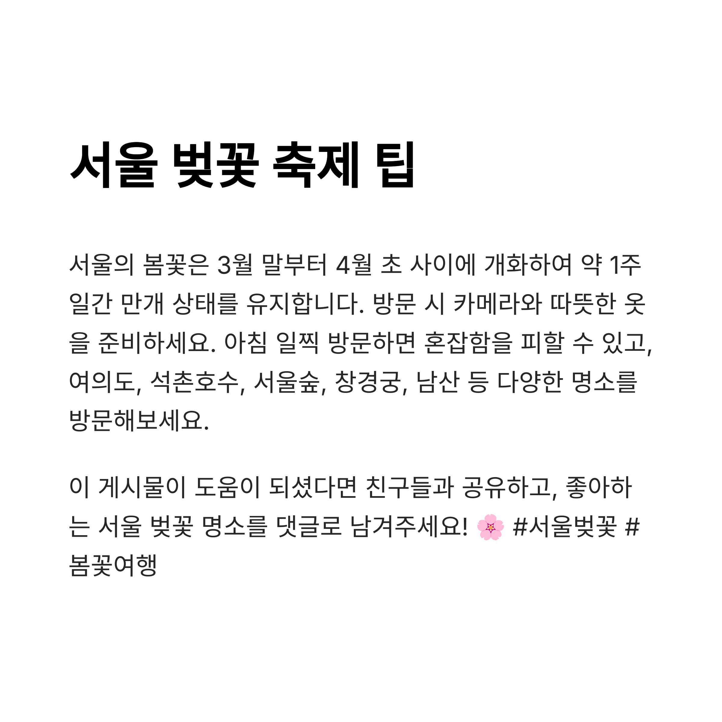서울 봄꽃 축제는 가족, 연인, 친구들과 함께 봄의 아름다움을 만끽할 수 있는 최고의 기회입니다.
