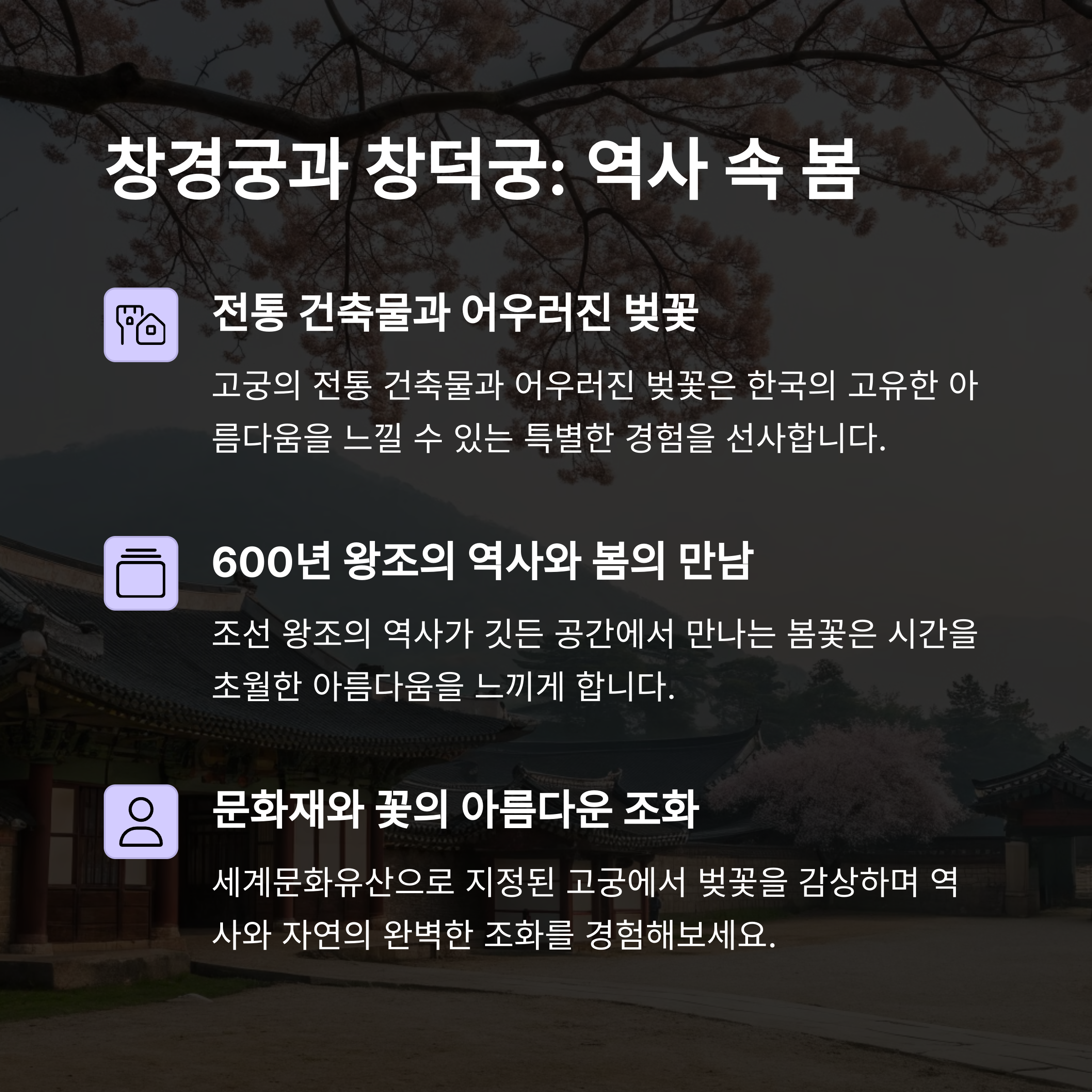 창경궁창덕궁등 왕궁에서는 전통 문화와 봄꽃의 조화를 경험하는 특별한 시간을 보낼 수 있습니다.