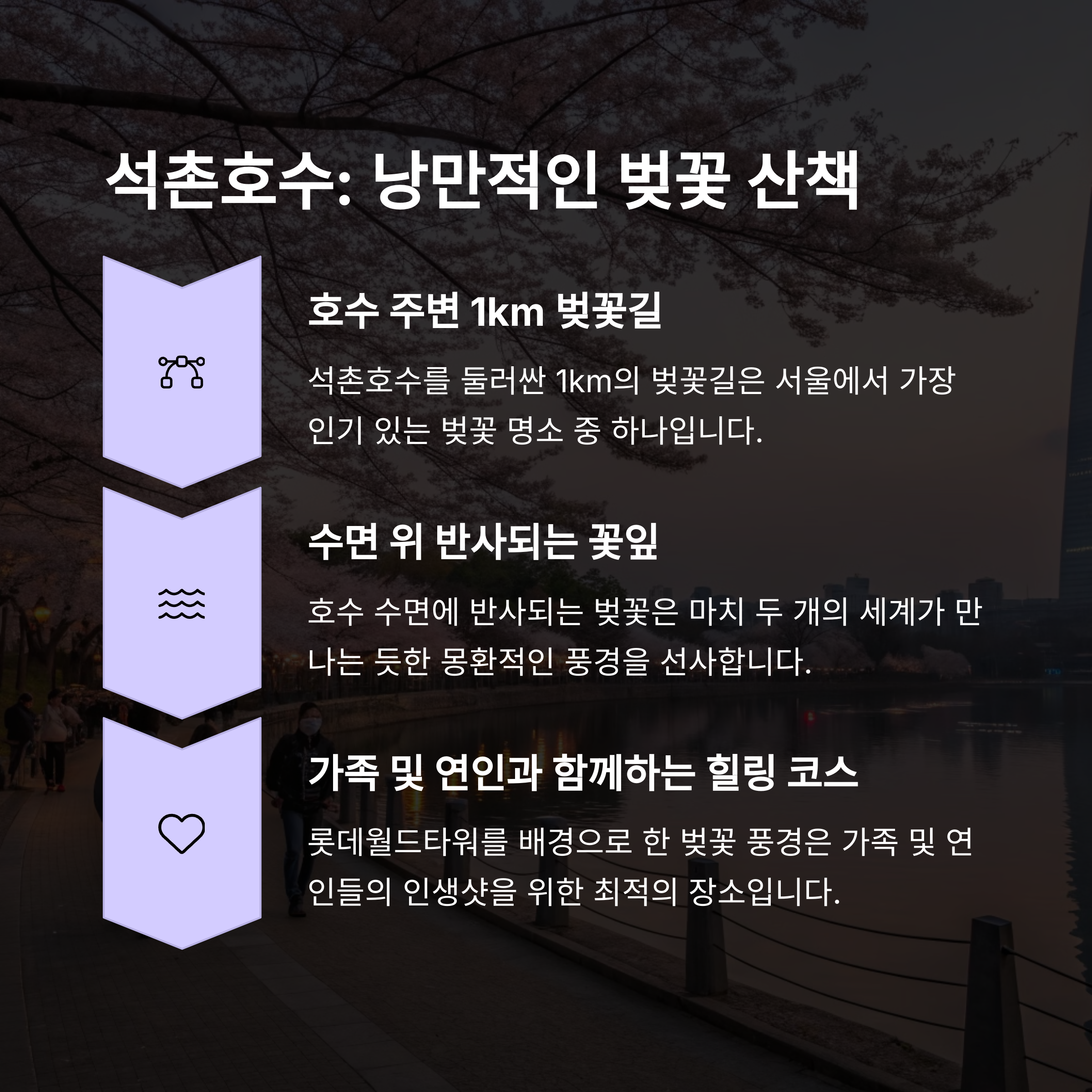 석촌호수는 서울의 봄꽃 명소 중 하나로, 벚꽃 시즌만 되면 많은 사람들이 찾는 곳입니다.