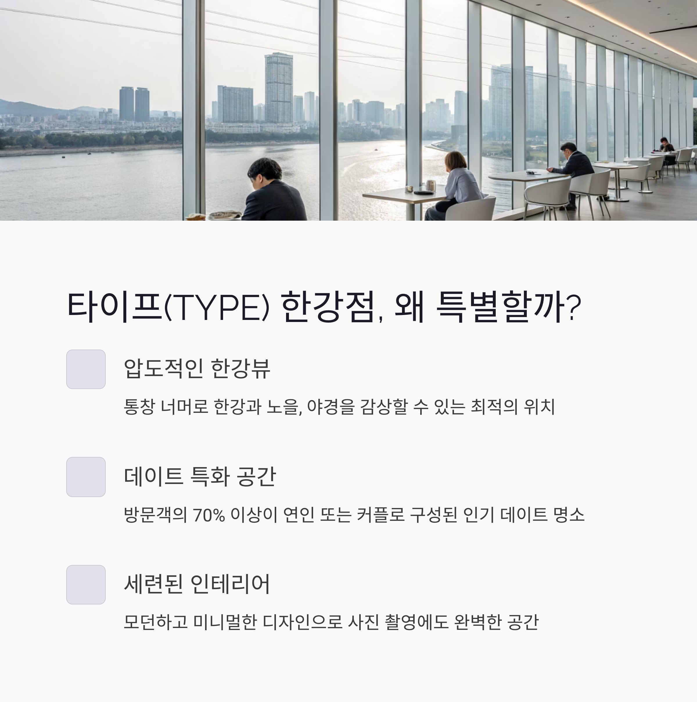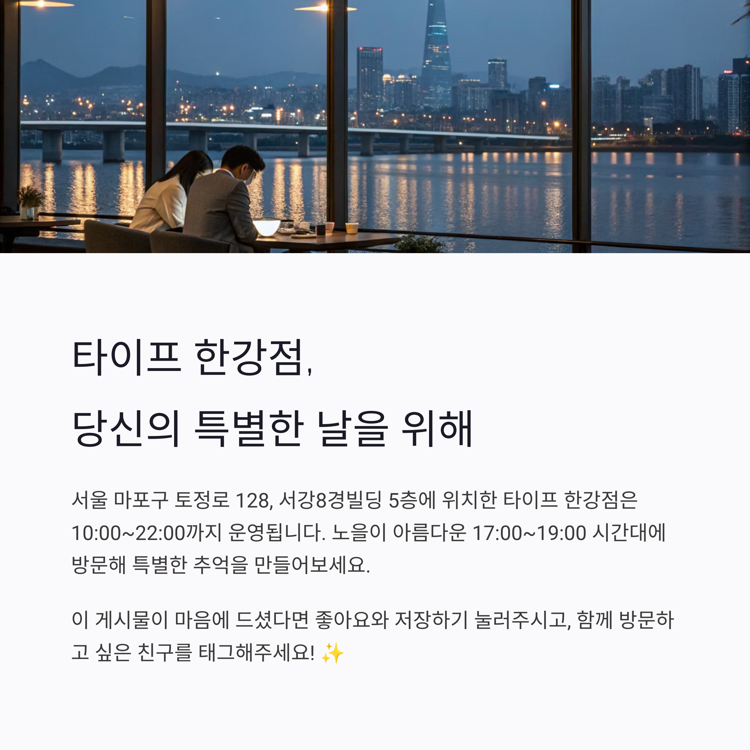 서울 마포구에 위치한 타이프(TYPE) 한강점은 최근 데이트 명소로 급부상하고 있습니다.