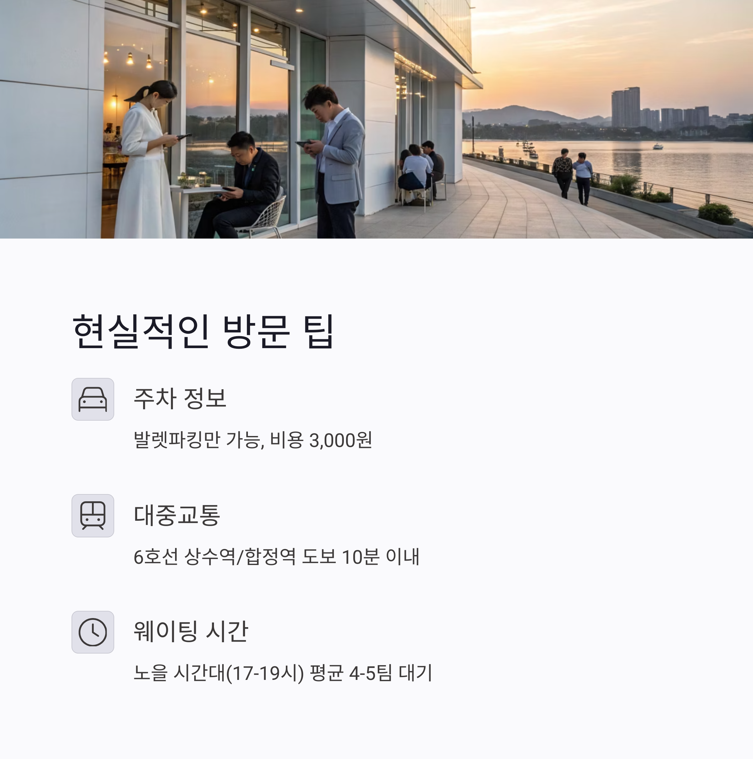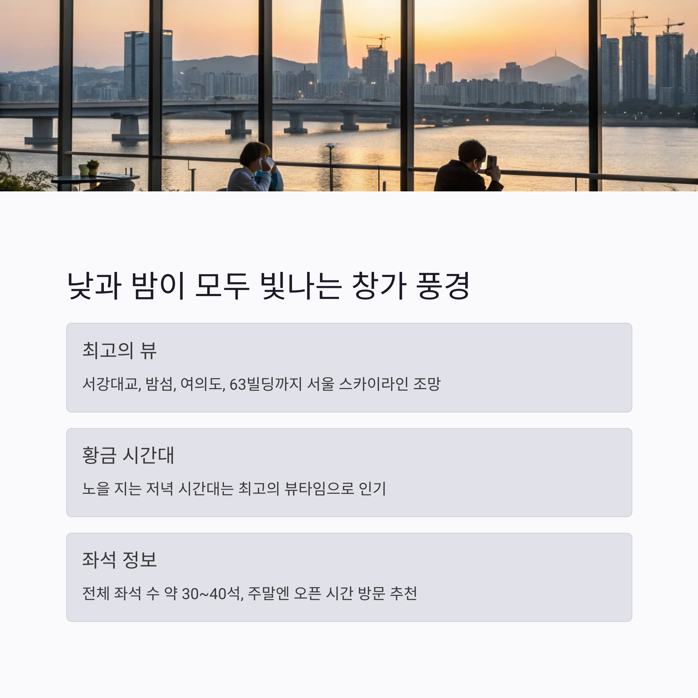 | 인기 시간대 | 주말 17:00~19:00 (노을 뷰) |