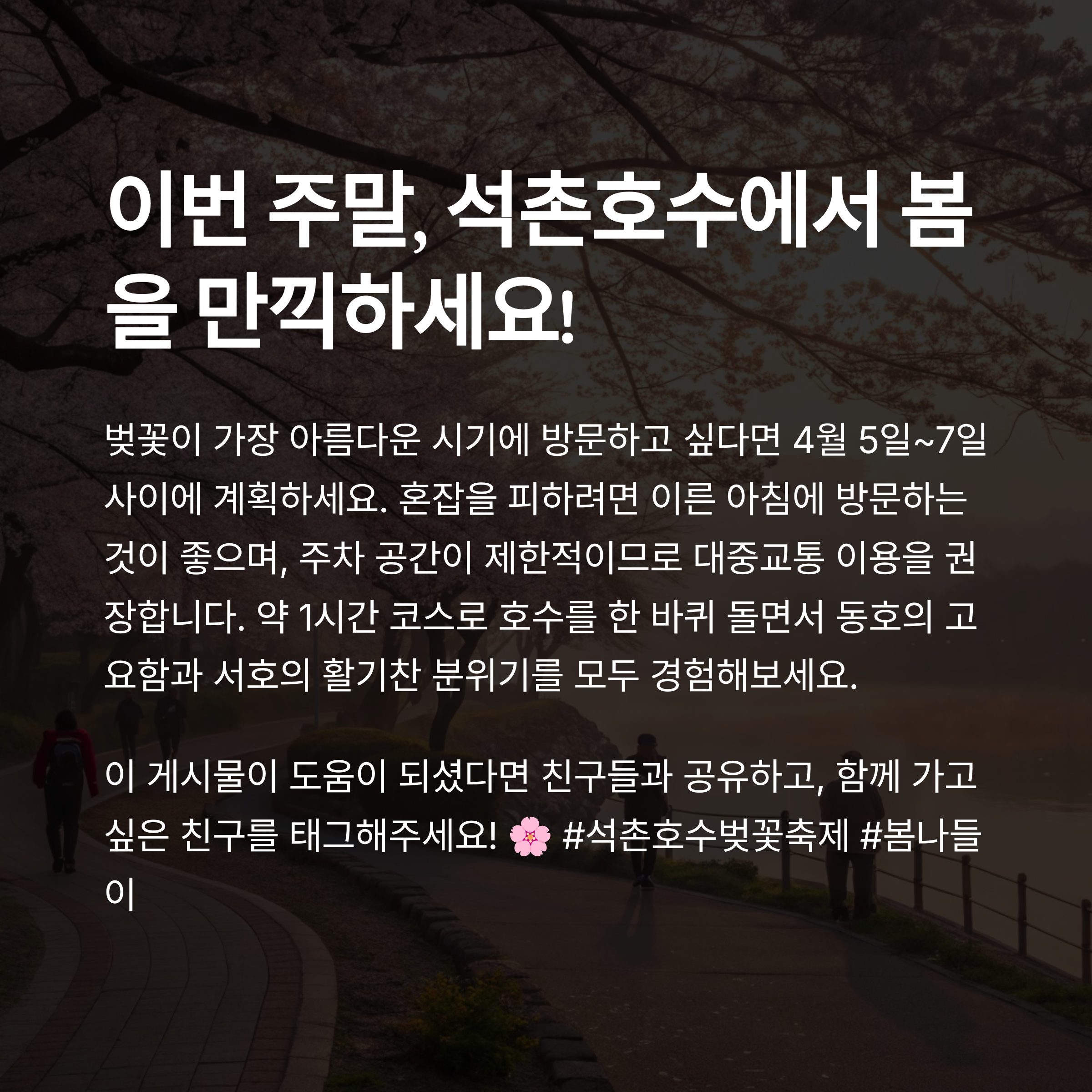 석촌호수 벚꽃에 대한 여러분의 소중한 경험이나 추천 팁이 있다면 댓글로 공유해주세요. 함께 정보를 나누며 더욱 풍성한 벚꽃 나들이를 만들어 봅시다!