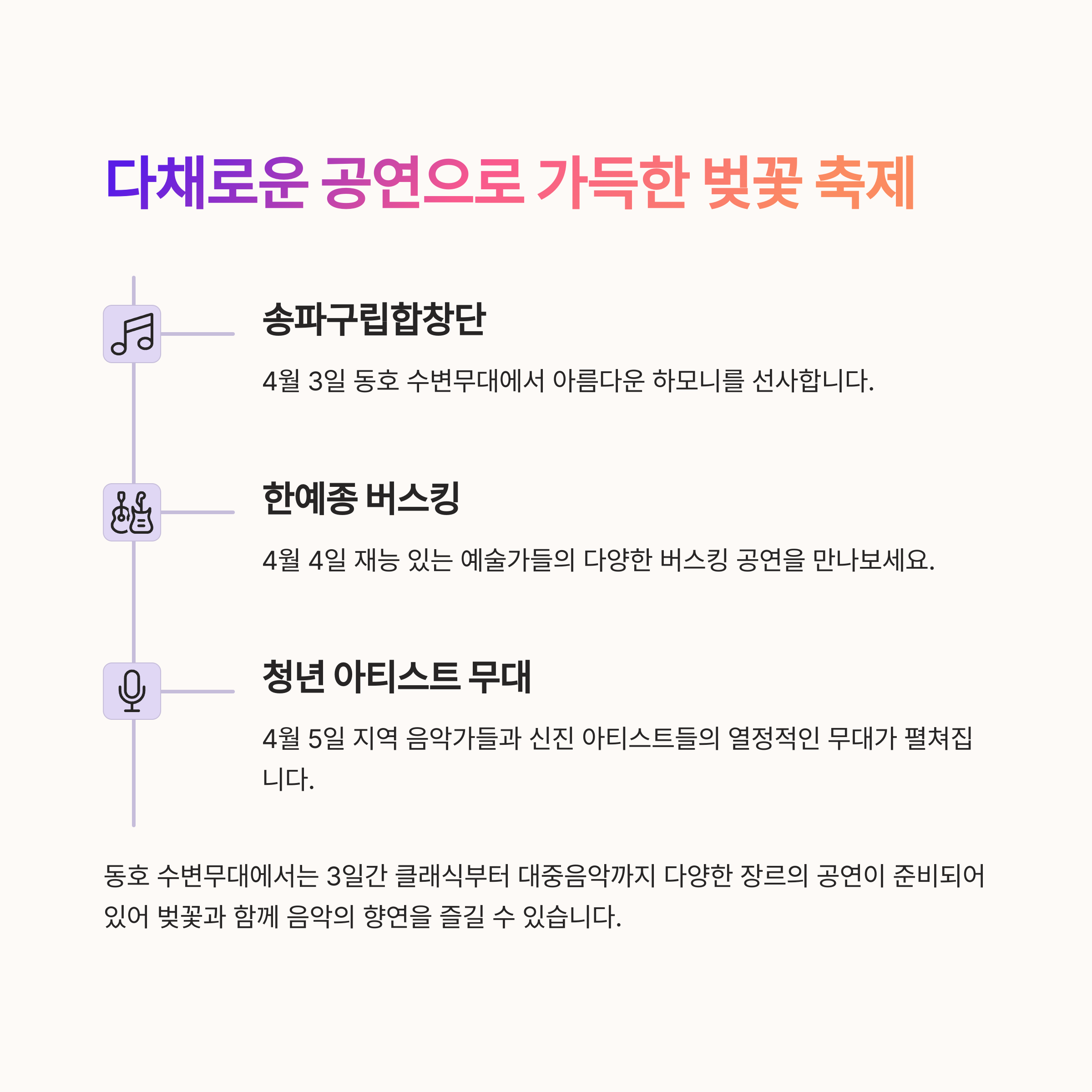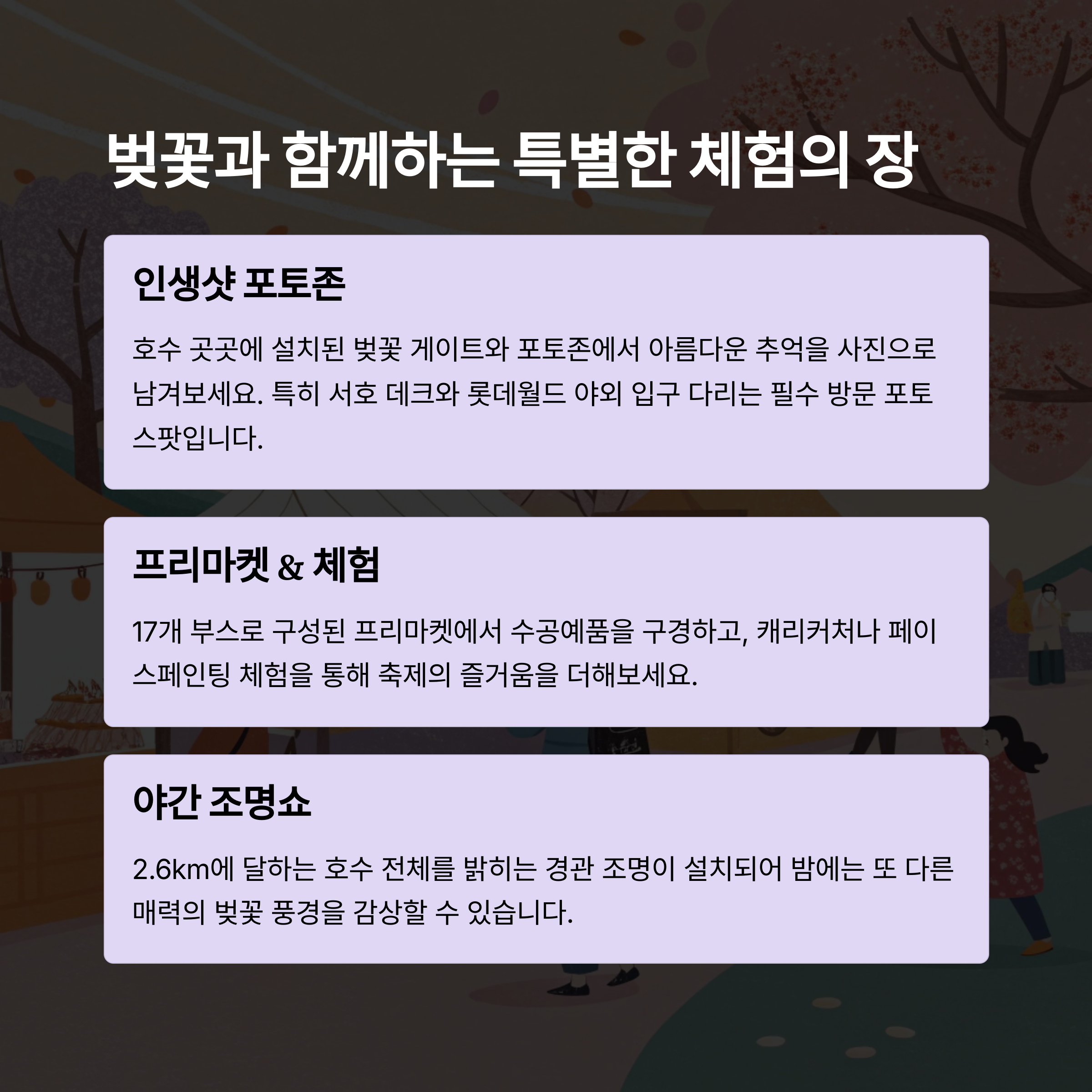 | 동호 30~50%, 서호 70% 개화 중 | 동호는 한적, 서호는 활기찬 분위기 | 4월 2일 ~ 6일, 다양한 행사 진행 |