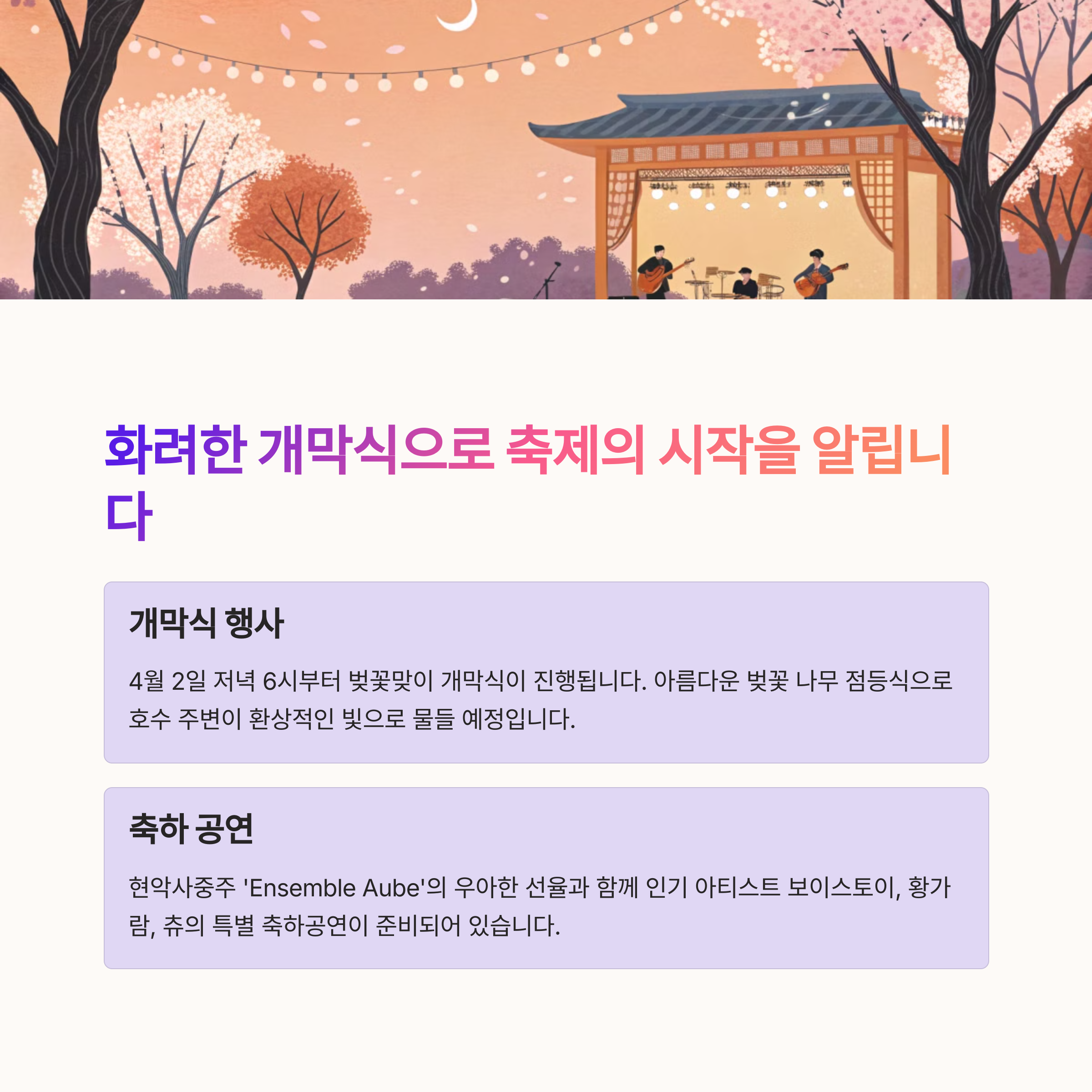 | 축제 일정 | 4월 2일 ~ 4월 6일 다양한 즐길 거리 제공 |