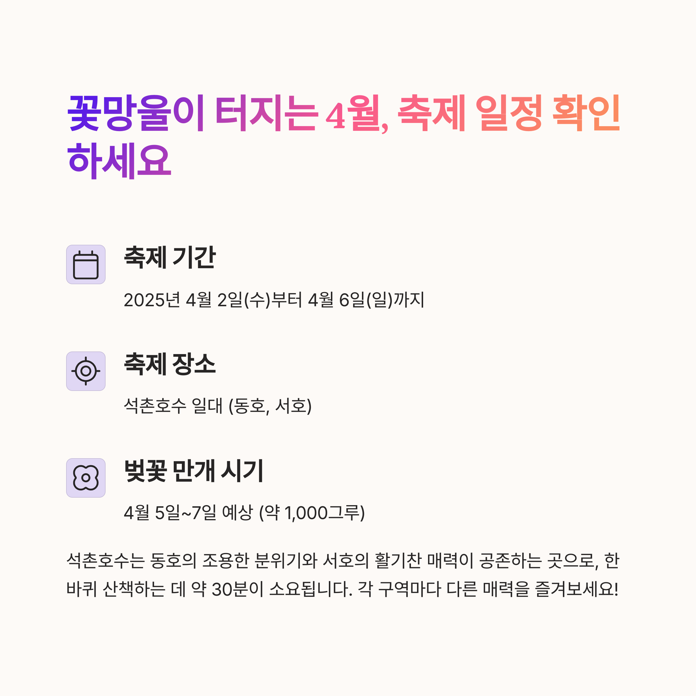석촌호수 벚꽃축제는 2025년 4월 2일부터 6일까지 진행되며, 축제 기간 동안 다채로운 행사들이 펼쳐집니다. 음악 공연과 프리마켓, 포토존, 벚꽃 마켓 등 다양한 프로그램이 마련되어 방문객들의 오감을 만족시켜 줍니다. 동호에서는 여유로운 산책을 즐기며 벚꽃의 아름다움을 만끽할 수 있고, 서호에서는 활기찬 분위기 속에서 축제의 재미를 느낄 수 있습니다. 축제 일정에 맞춰 방문하면 더욱 풍성한 볼거리와 즐길 거리를 경험할 수 있어, 봄철 특별한 하루를 보내기에 안성맞춤입니다.