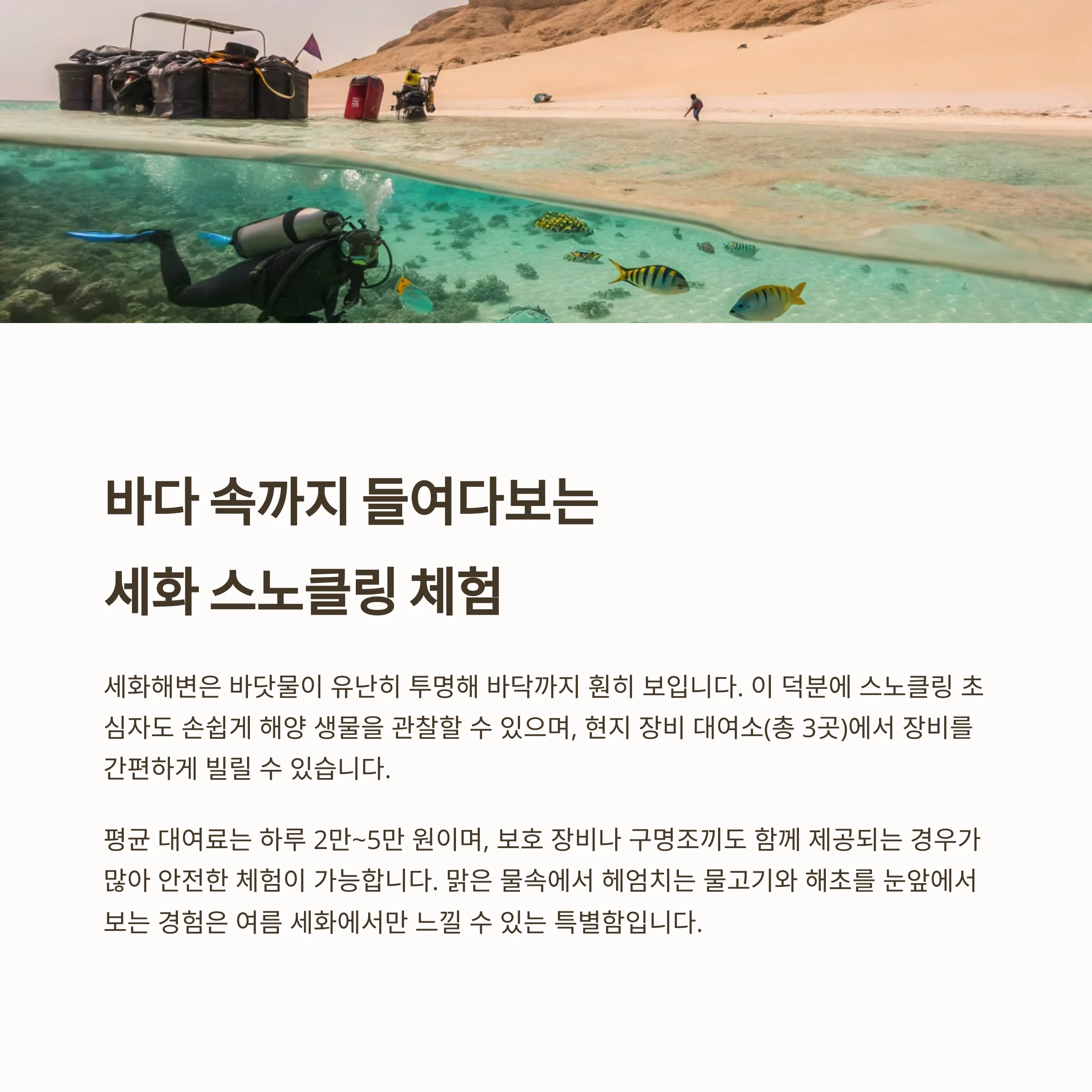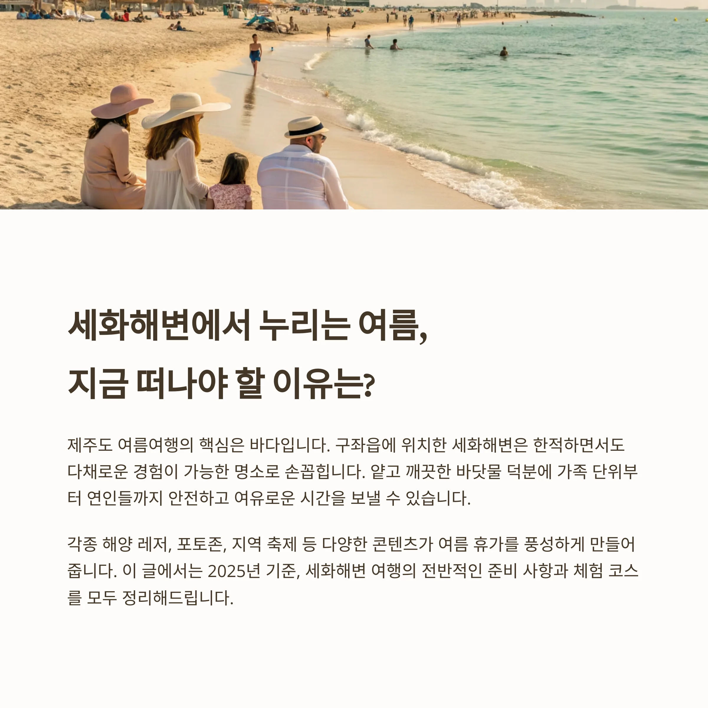 제주도 여름여행의 핵심은 바다입니다. 그중에서도 구좌읍에 위치한 세화해변은 한적하면서도 다채로운 경험이 가능한 명소로 손꼽힙니다. 얕고 깨끗한 바닷물 덕분에 가족 단위부터 연인들까지 안전하고 여유로운 시간을 보낼 수 있으며, 각종 해양 레저, 포토존, 지역 축제 등 다양한 콘텐츠가 여름 휴가를 풍성하게 만들어줍니다. 이 글에서는 2025년 기준, 세화해변 여행의 전반적인 준비 사항과 체험 코스를 모두 정리해드립니다.