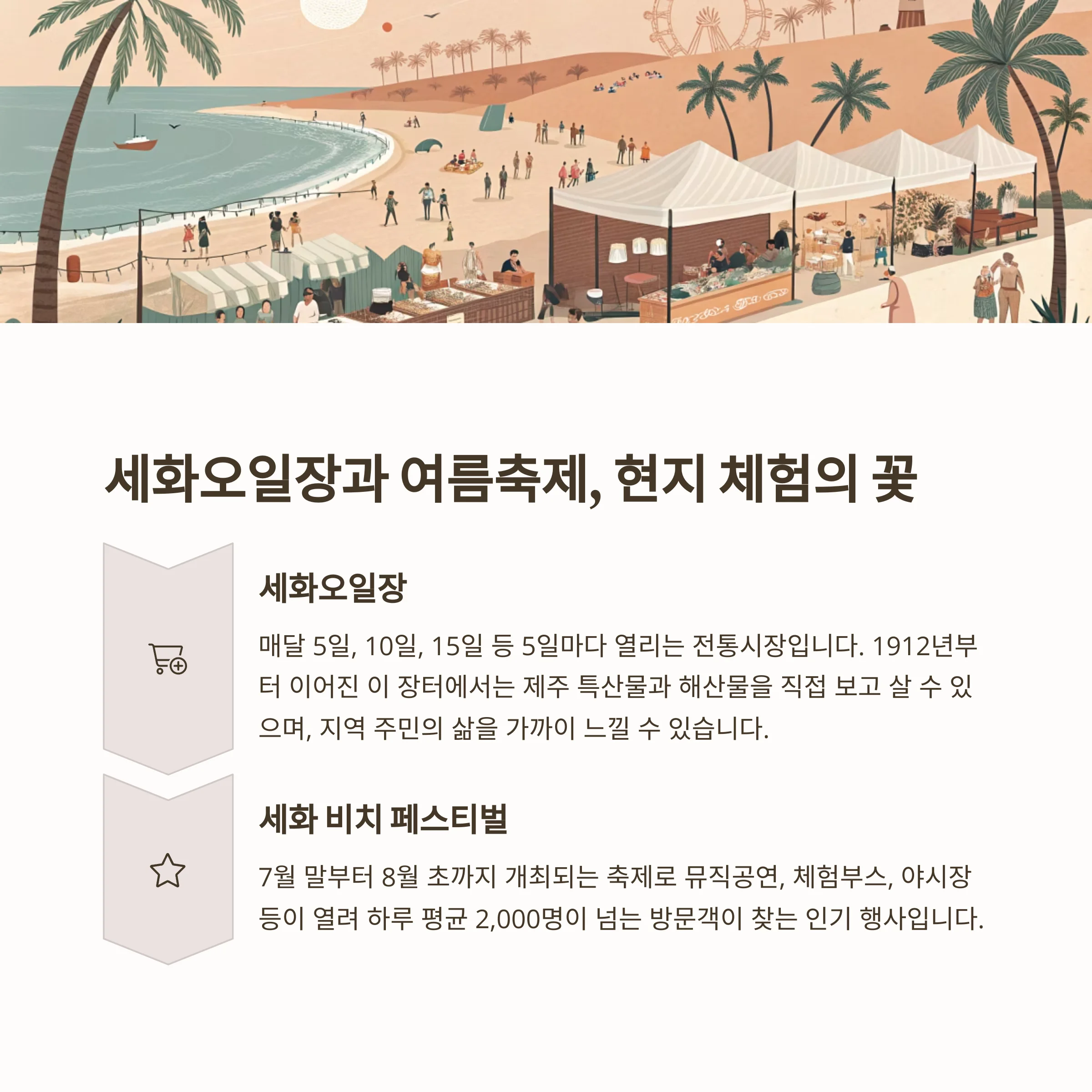 | 축제·시장 일정 확인 | 방문 전 세화오일장 및 페스티벌 일정 확인 필요 |