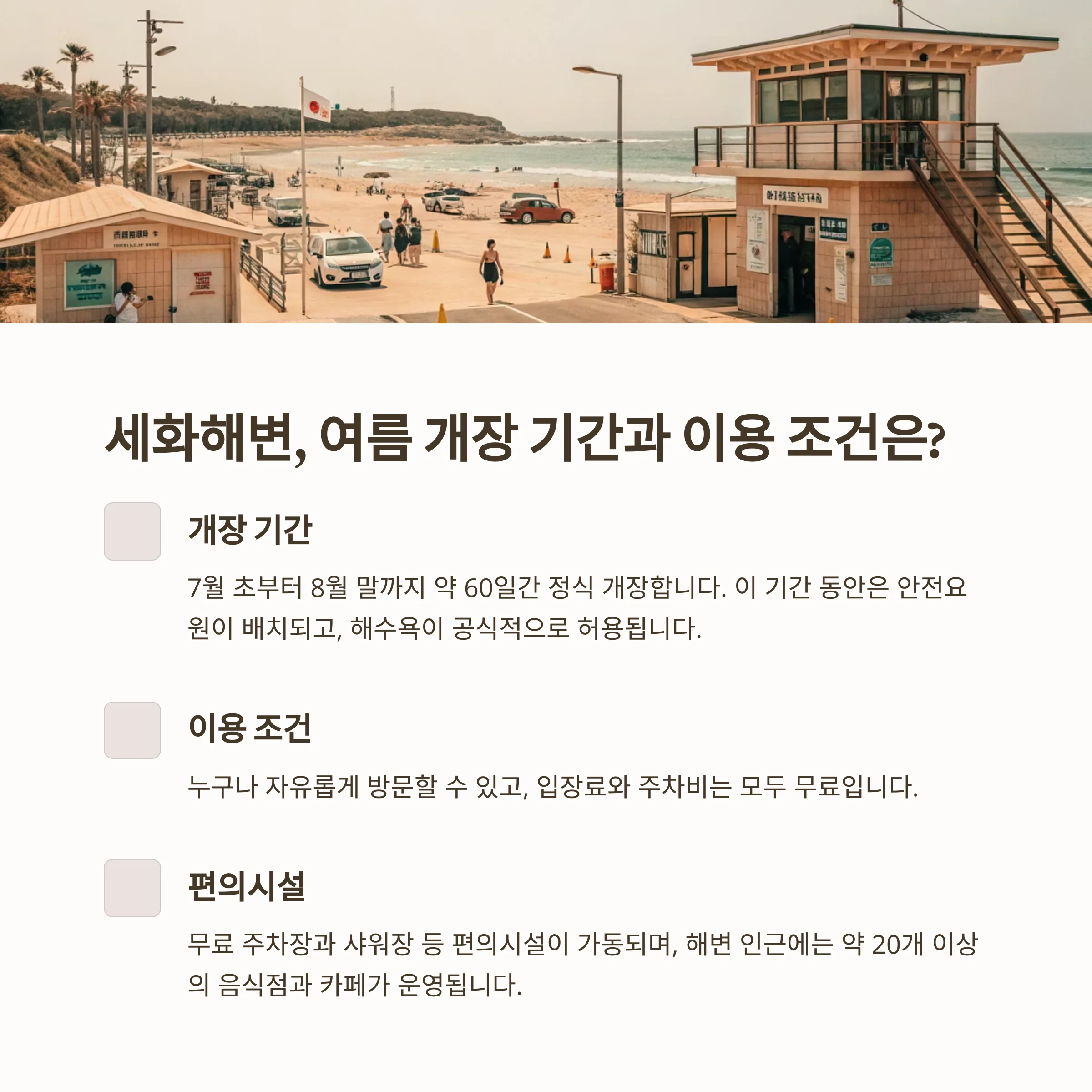 | 주차장 위치 | 해변 인근 총 3곳, 약 150대 수용 가능 |
