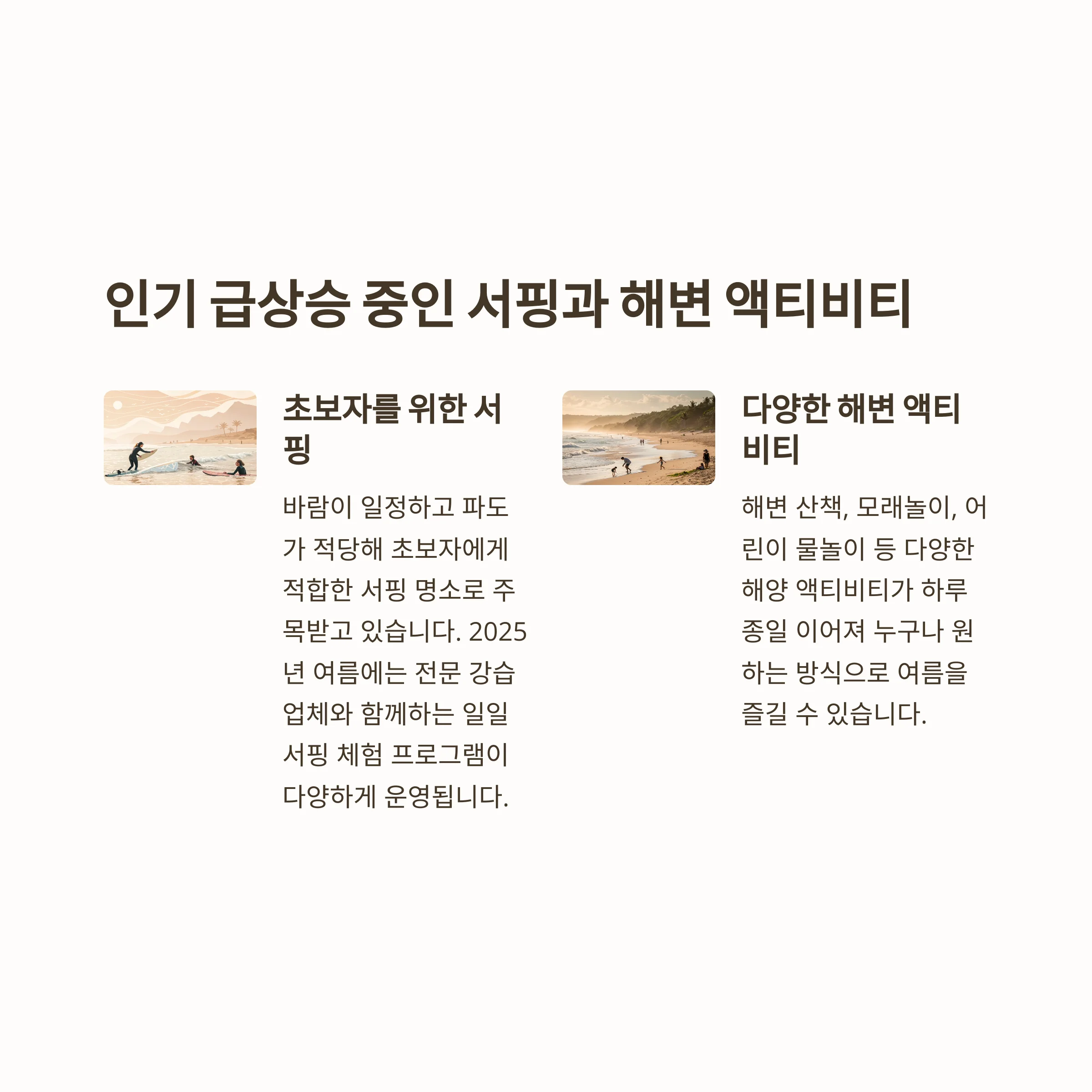 초보자에게 적합한 서핑 명소로도 주목받고 있습니다.