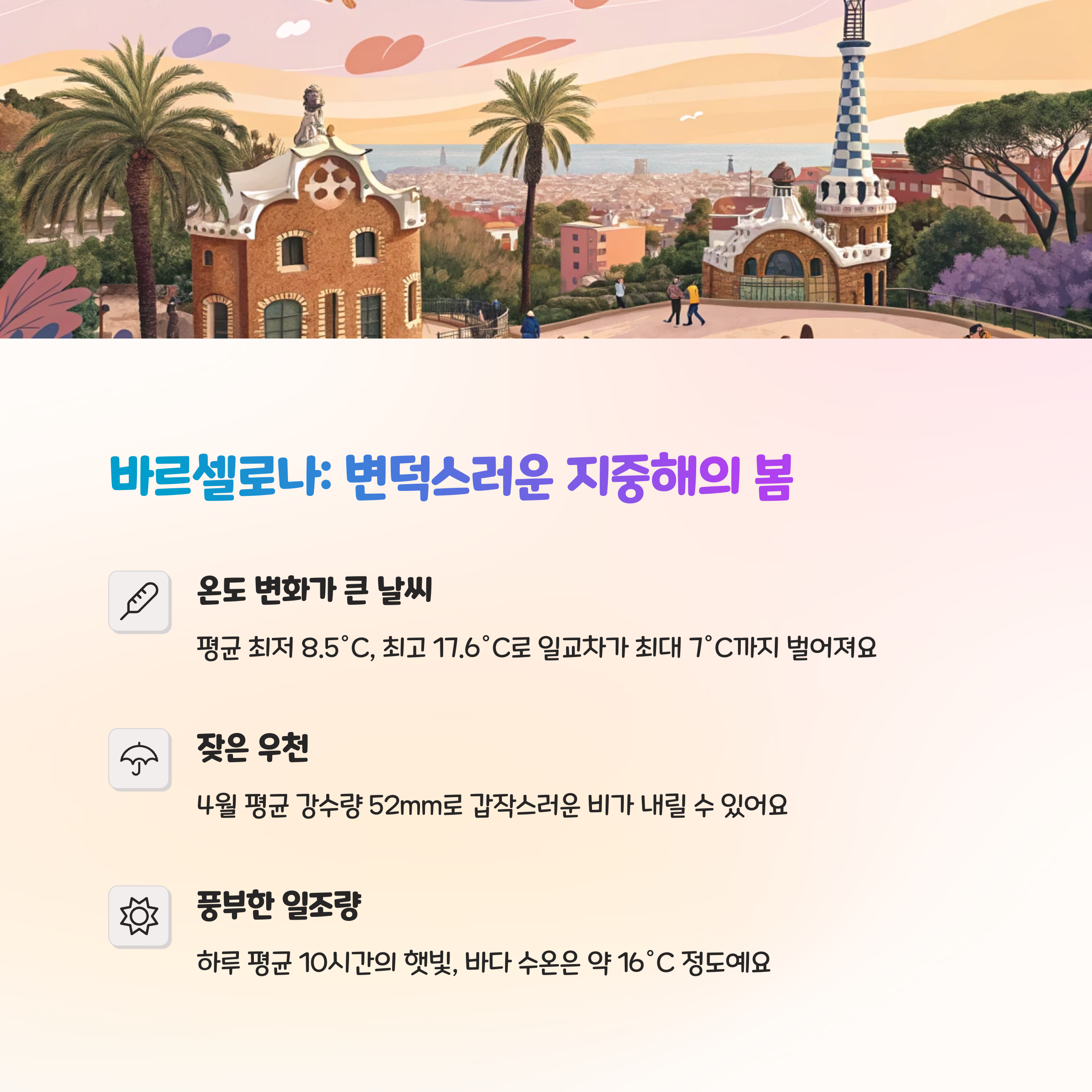 바르셀로나는 해안도시로 비교적 온화한 4월 날씨를 보이나, 비 소식이 잦습니다.