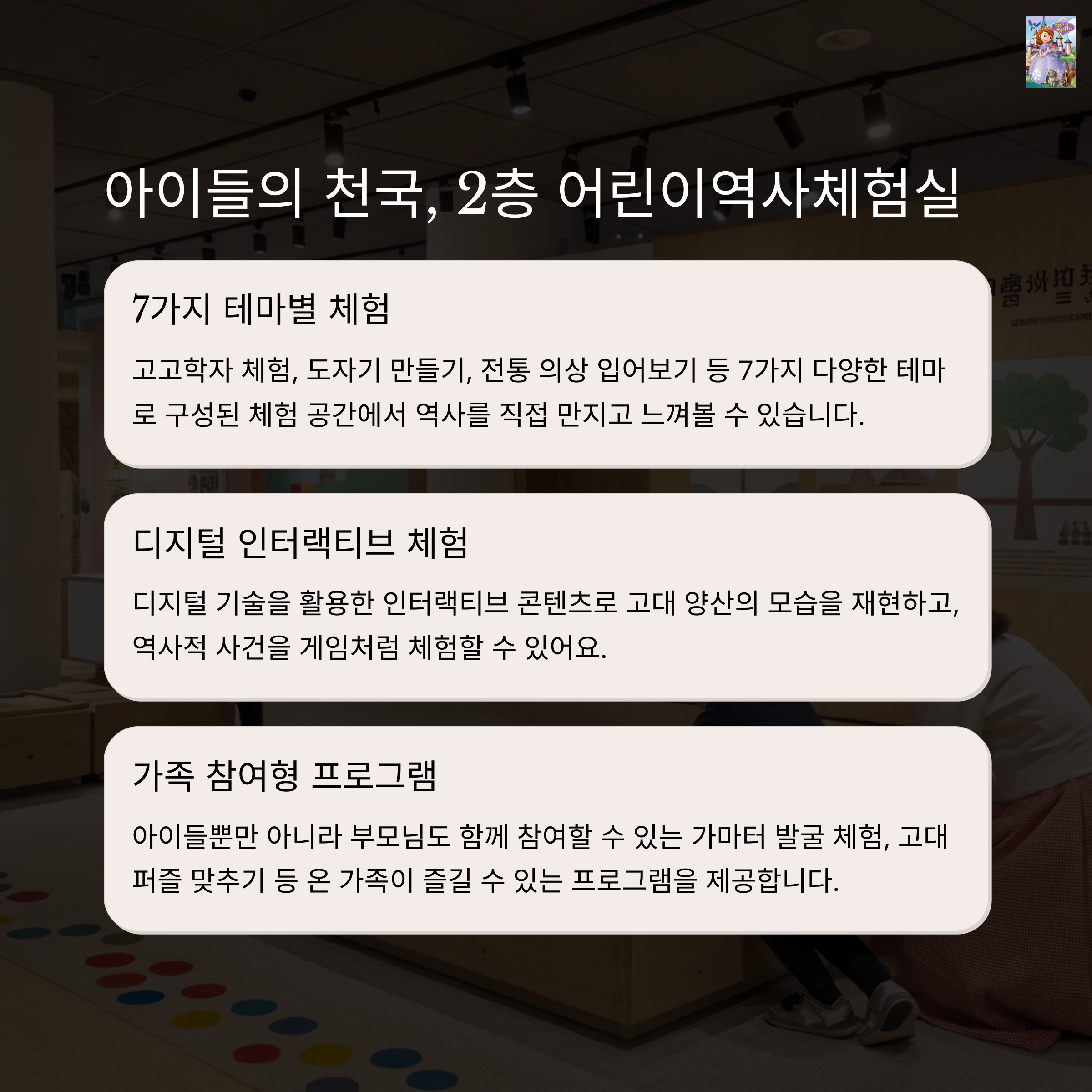 어린이 프로그램이 다양하여 가족 단위 방문객에게 적극 추천할 수 있습니다.