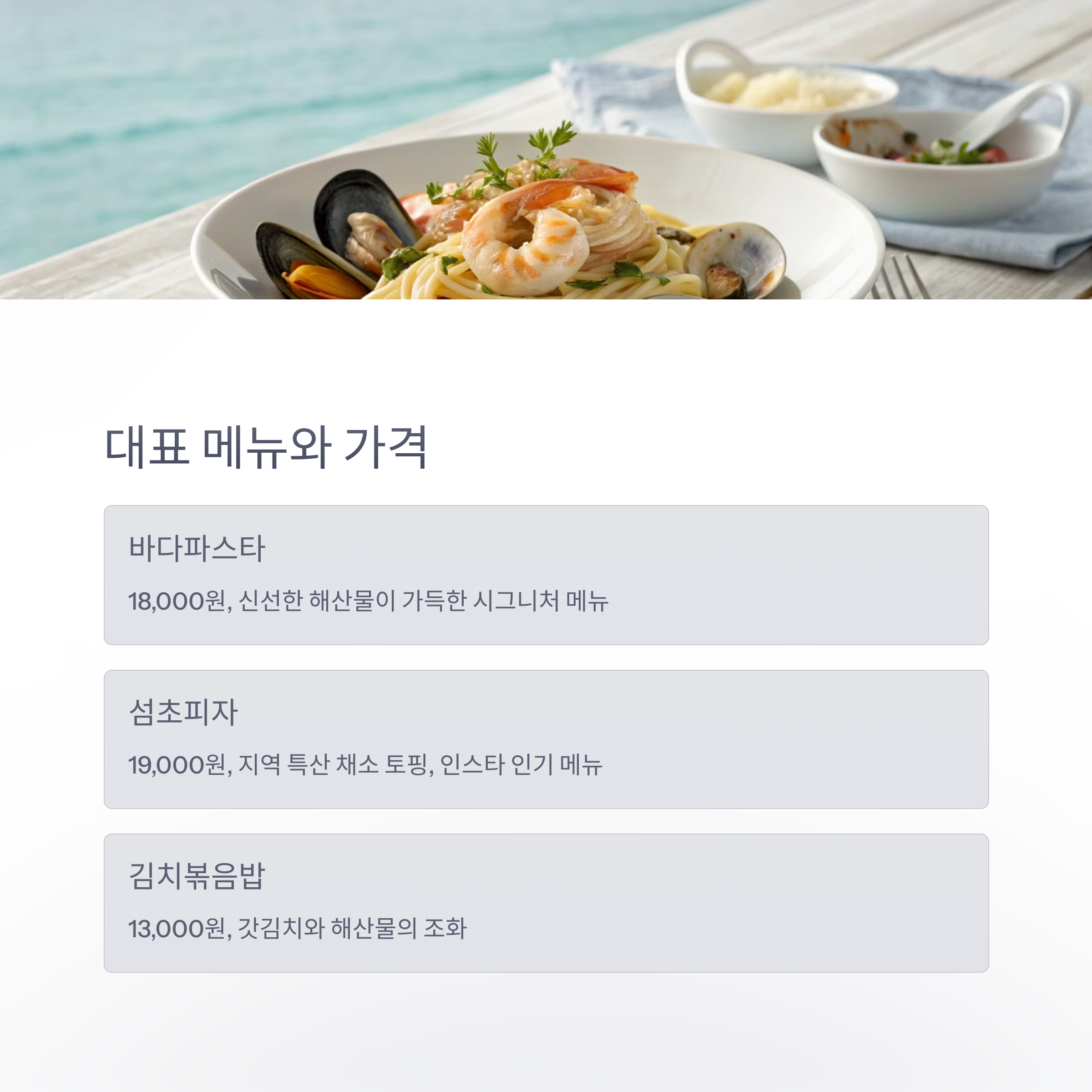 | 대표 메뉴 | 바다파스타, 섬초피자, 김치볶음밥 |