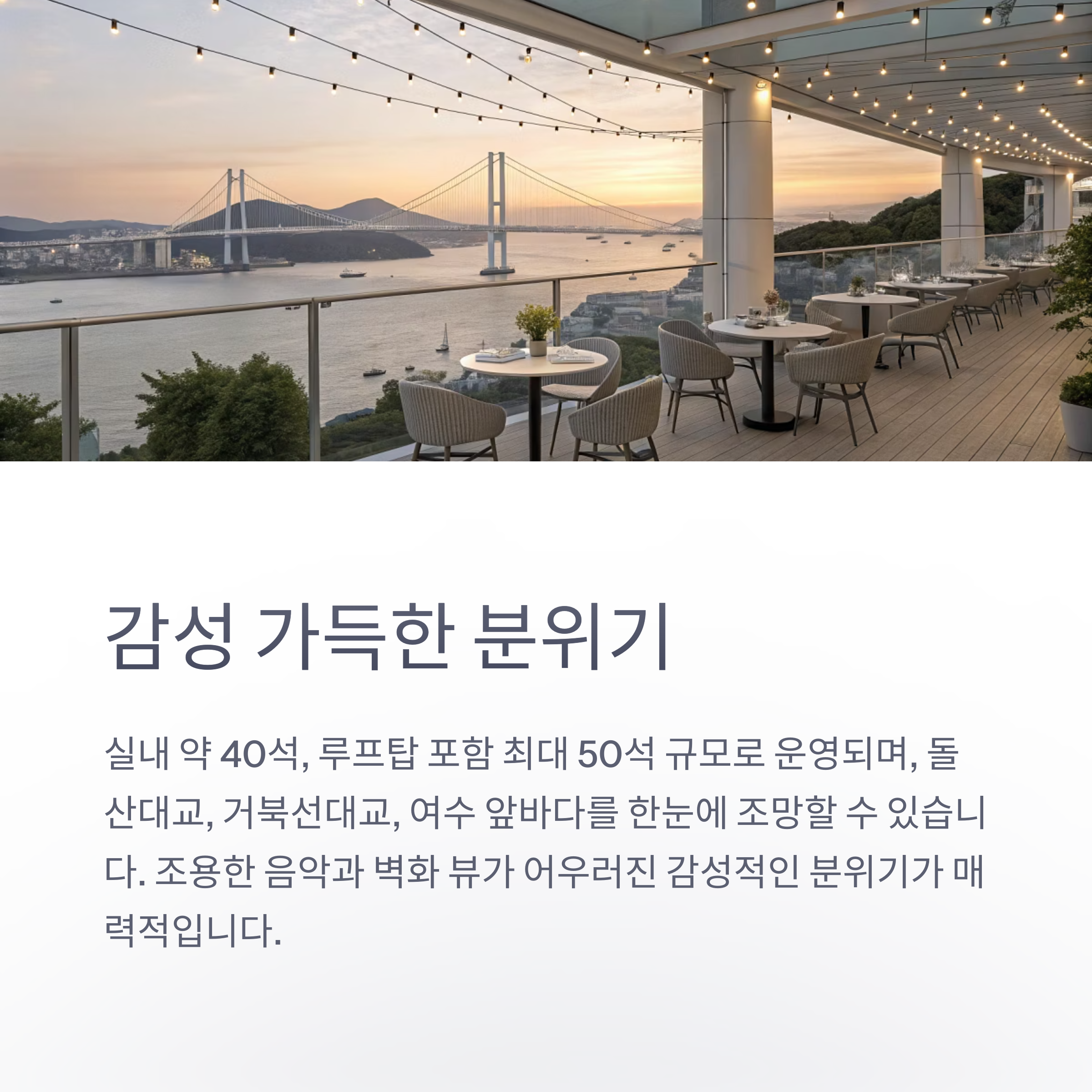전망은 돌산대교, 거북선대교, 여수 앞바다를 한눈에 조망할 수 있어 특히 저녁 시간이 인기입니다.