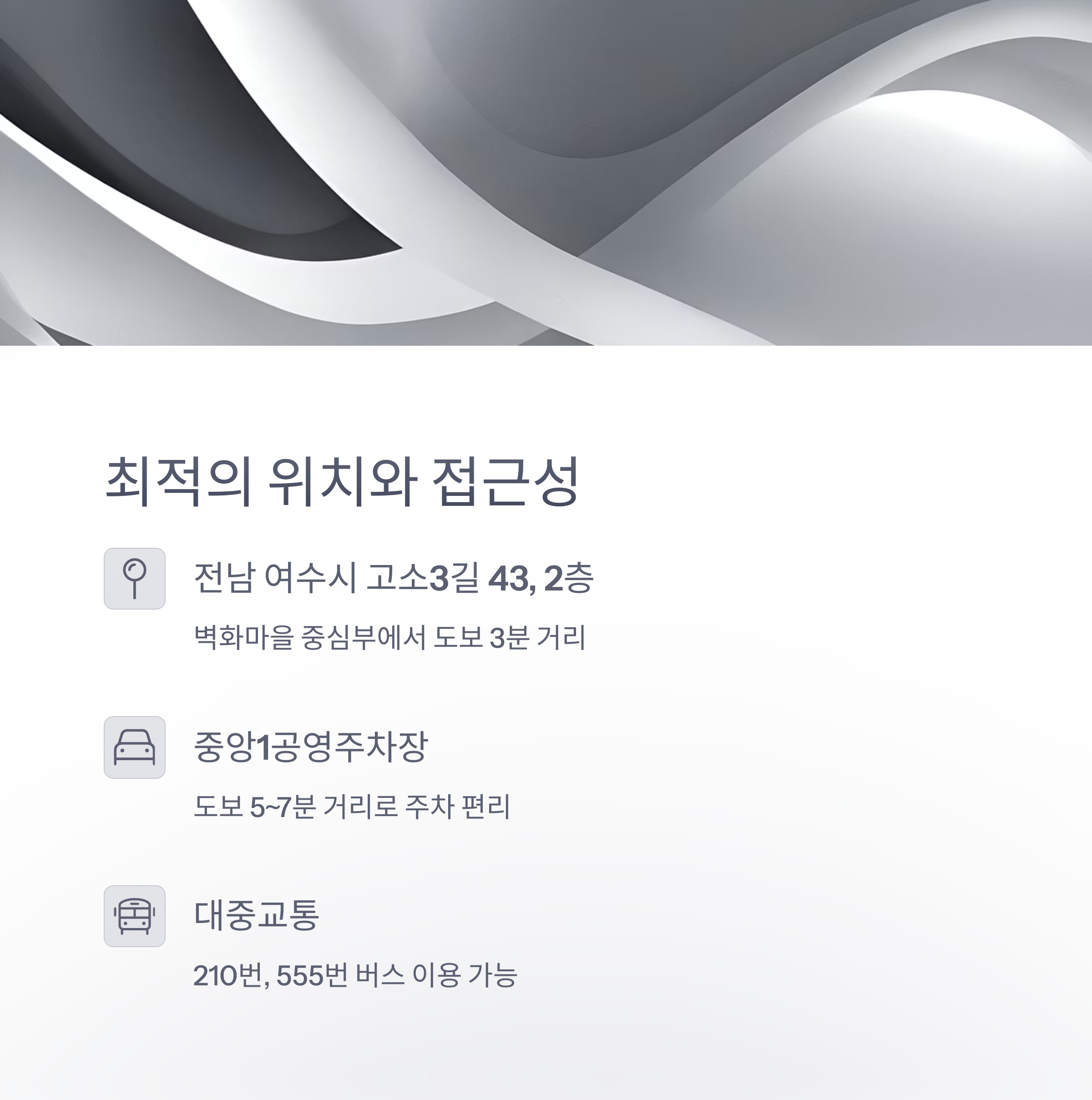 | 대중교통 | 버스 210번, 555번 (하차 후 도보 2~8분) |