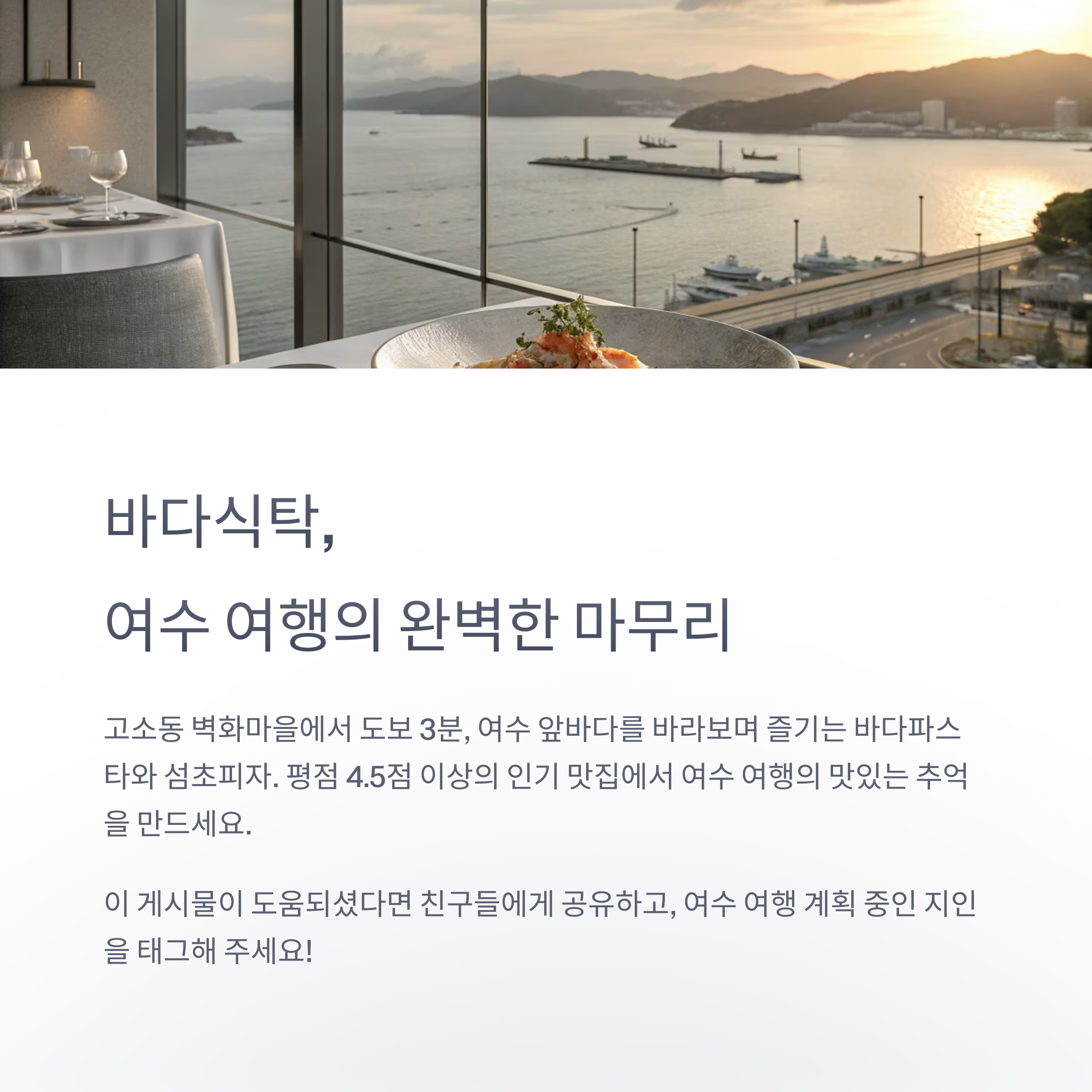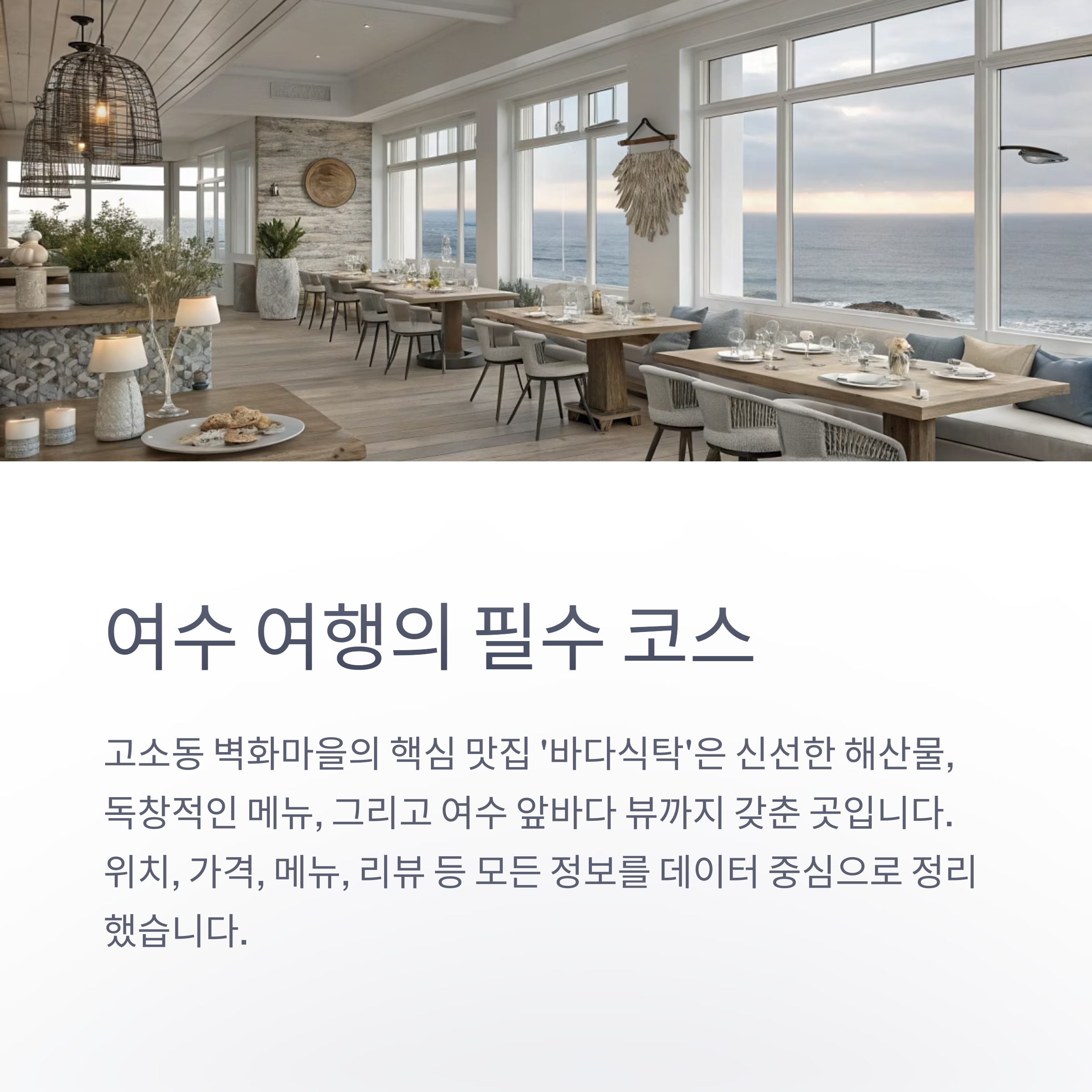 신선한 해산물, 독창적인 메뉴, 그리고 여수 앞바다가 한눈에 보이는 뷰까지 갖춘 이곳은