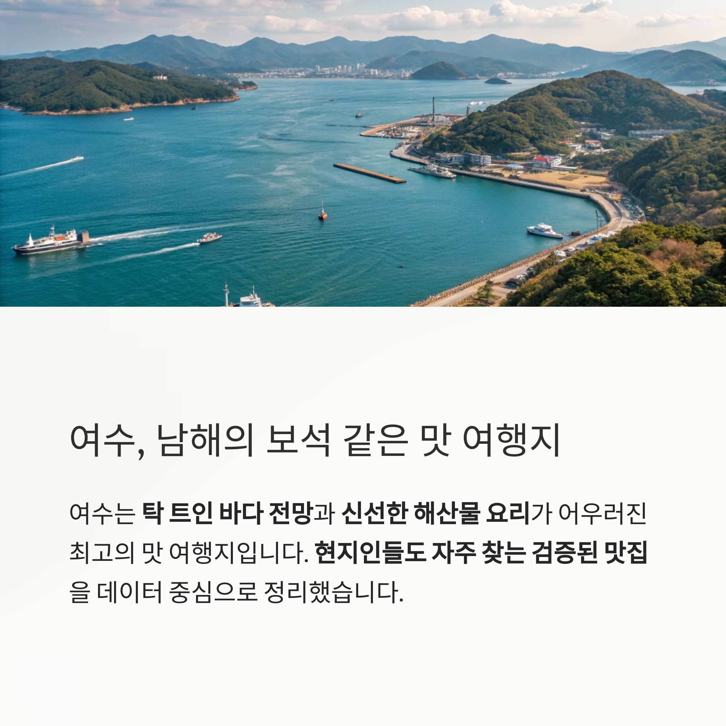 여수는 남해의 보석 같은 도시로, 탁 트인 바다 전망과 신선한 해산물 요리가 어우러진 최고의 맛 여행지입니다. 특히 오션뷰를 자랑하는 맛집들은 단순한 관광 명소가 아닌, 현지인들도 자주 찾는 검증된 맛집으로 손꼽힙니다. 2024~2025년 기준, 진짜 여수 현지 추천 맛집 정보를 데이터 중심으로 정리해 드립니다.