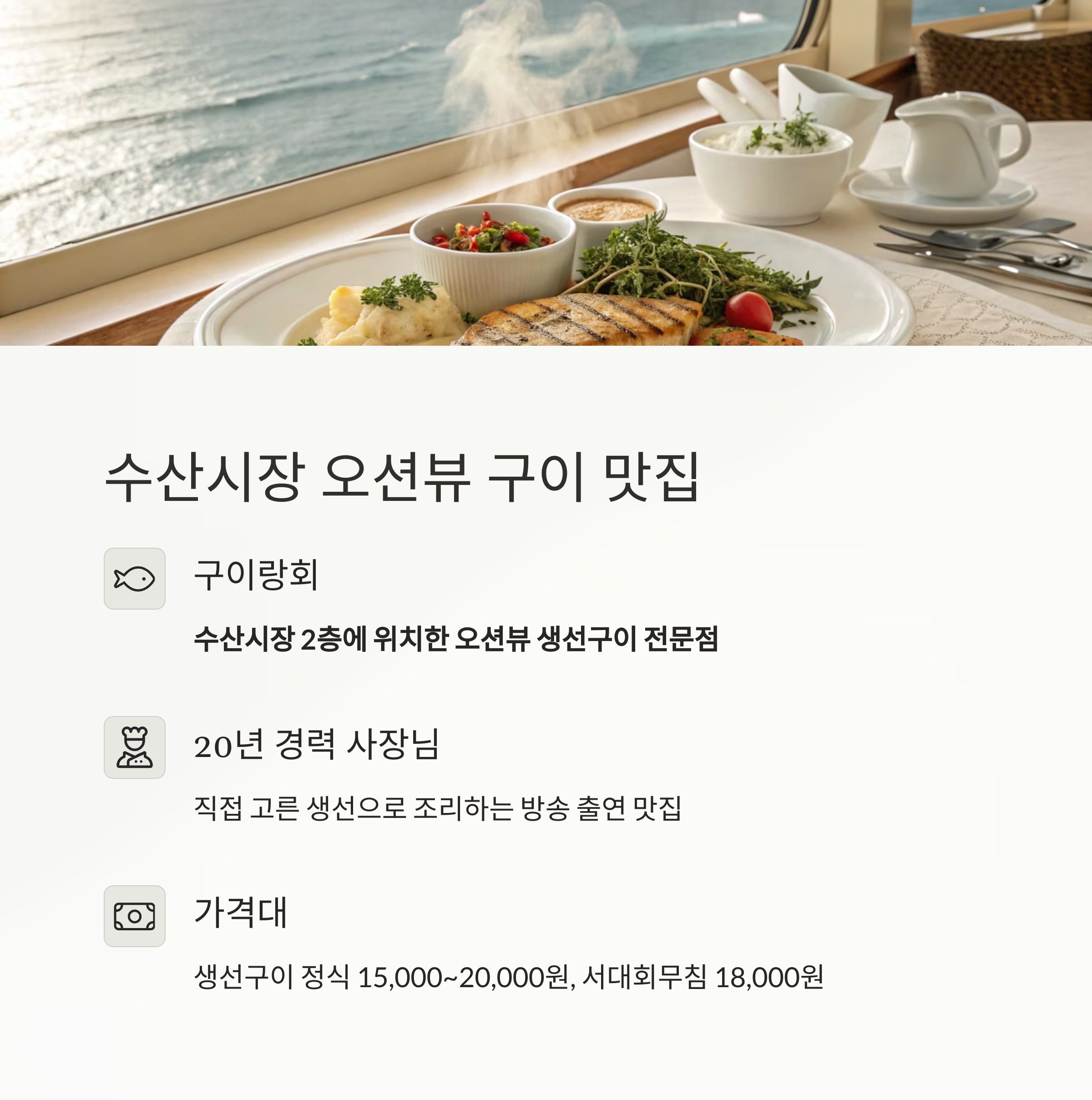 '구이랑회'는 수산시장 2층에 위치한 오션뷰 생선구이 전문점입니다.