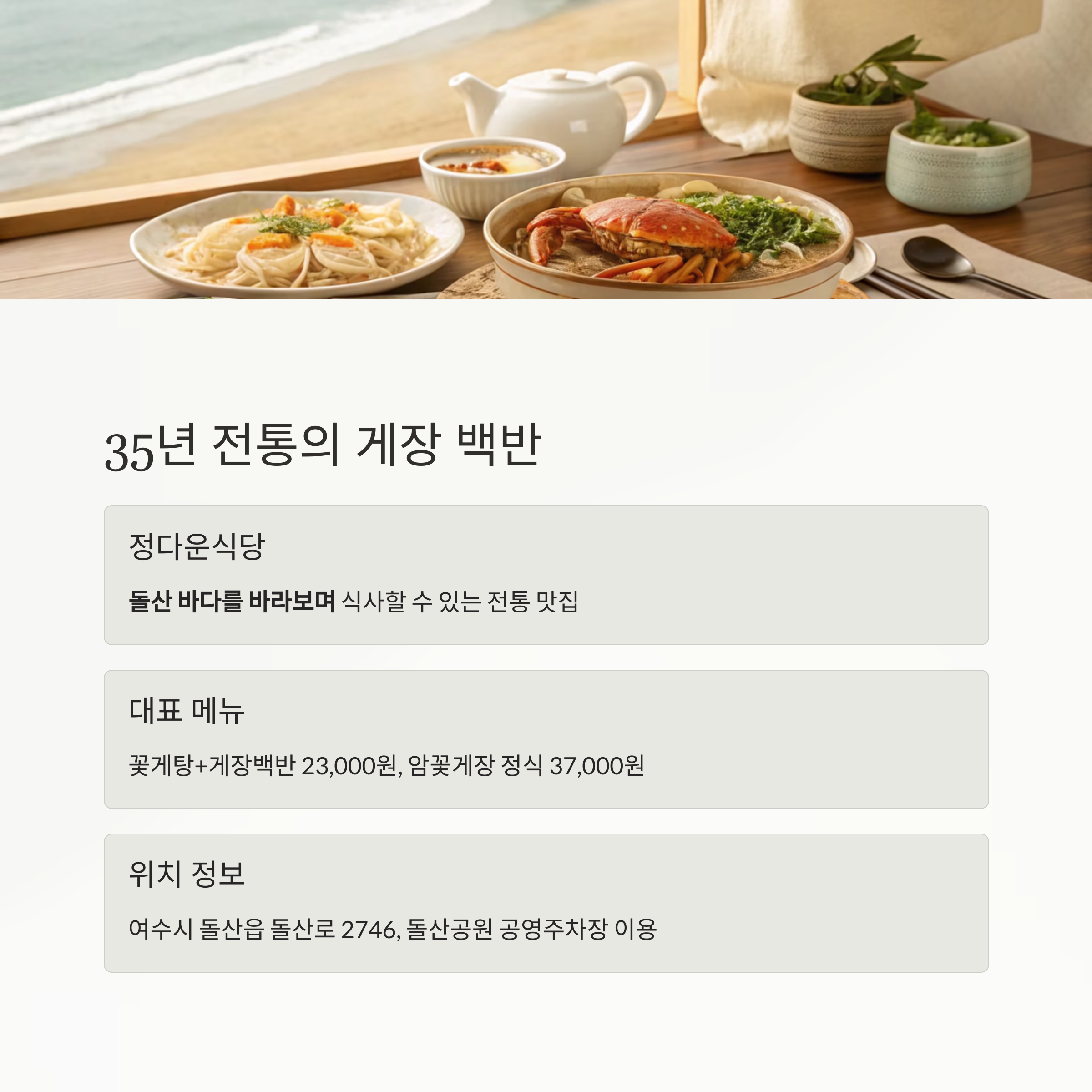 정다운식당은 돌산 바다를 바라보며 식사할 수 있는 전통 맛집입니다.