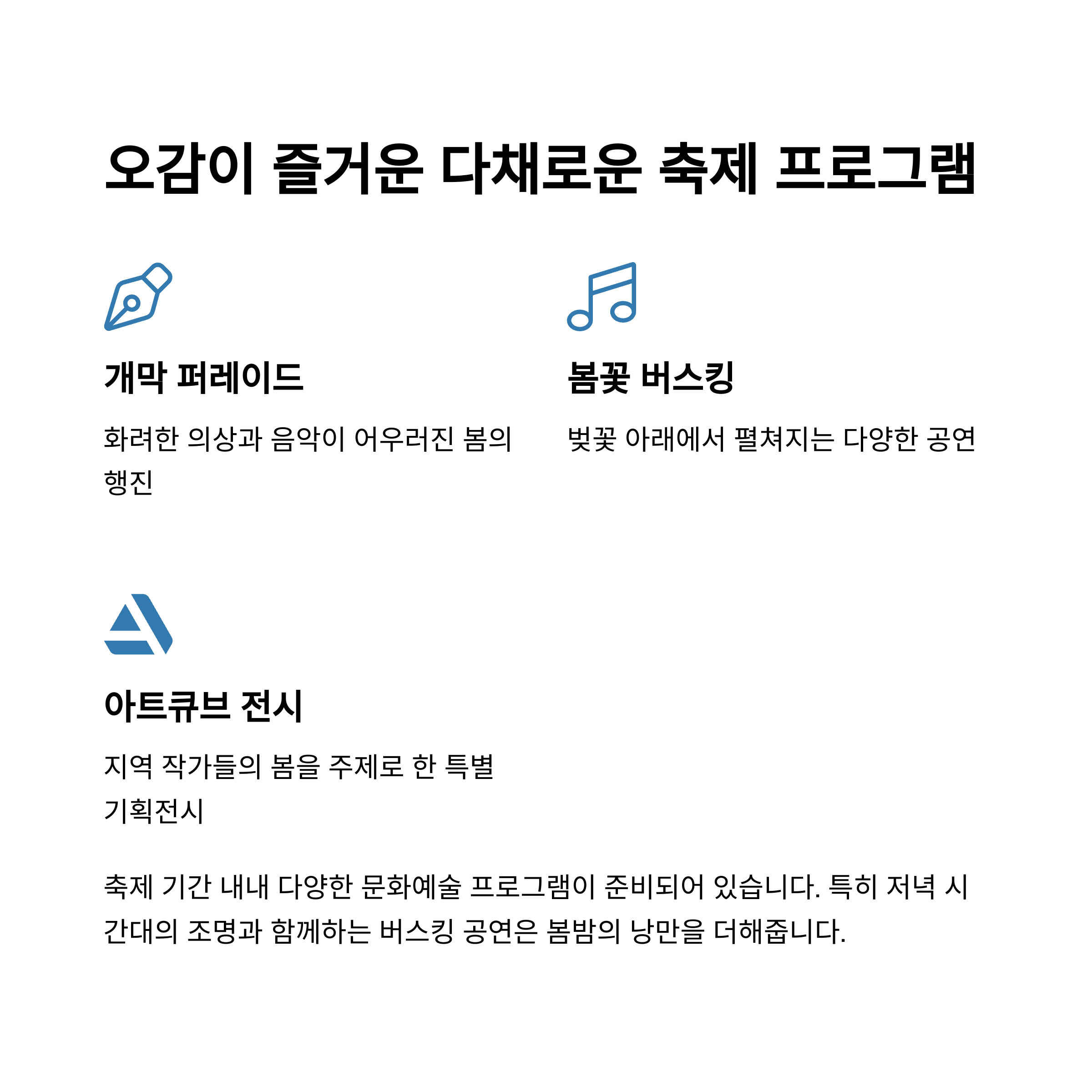 | 봄꽃 버스킹 | 4월 10일 | 벚꽃길 무대 | 실력파 공연 |