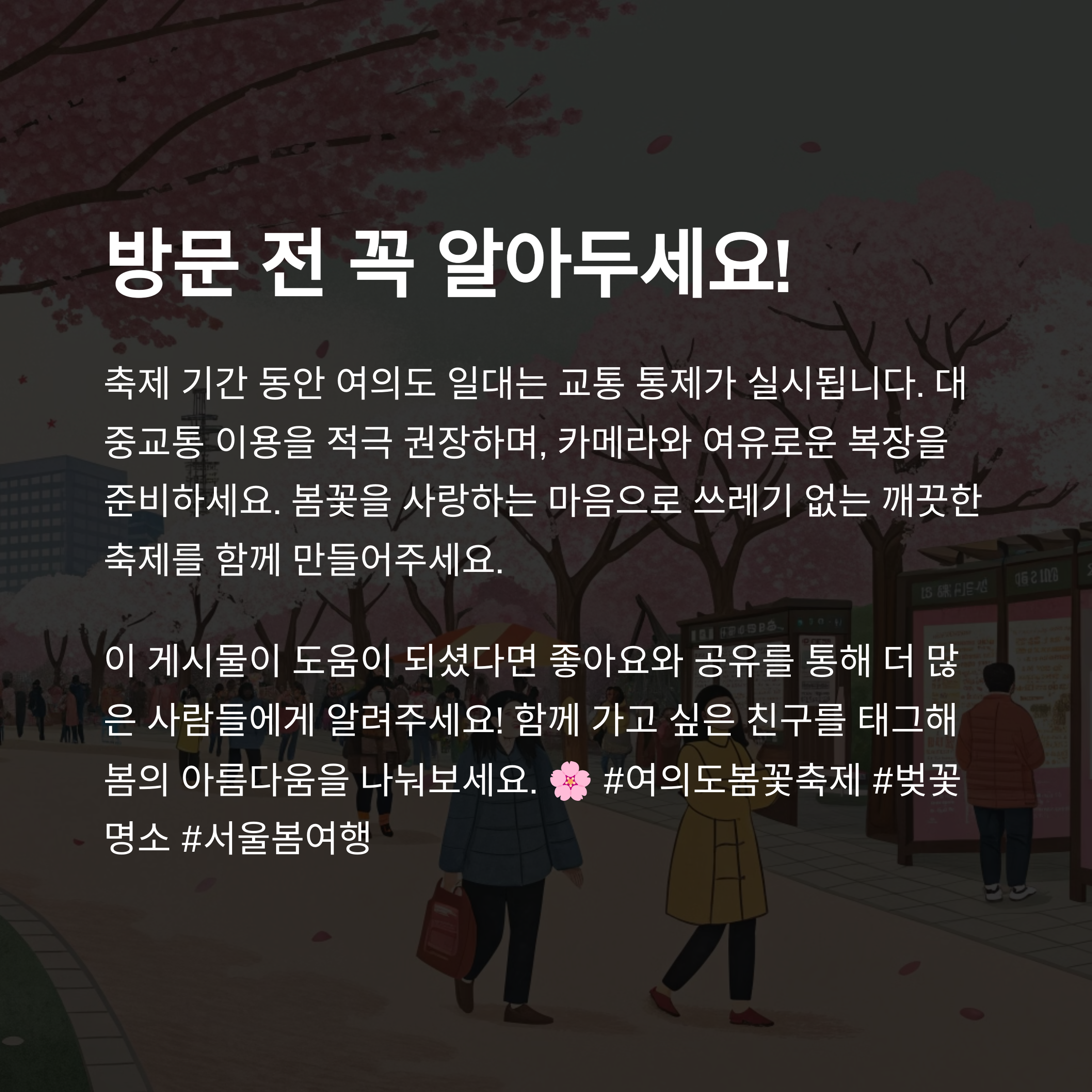 아름다운 봄을 만끽할 여의도 벚꽃 축제 소식을 준비했습니다.