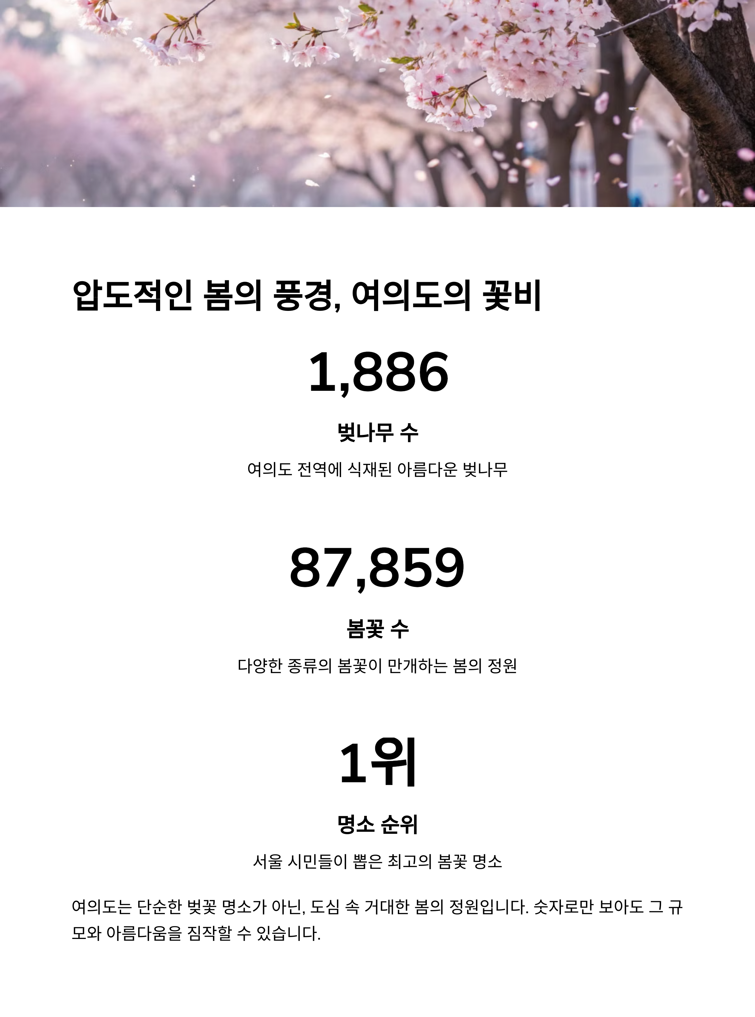 특히 여의도 윤중로는 약 1.7km의 긴 벚꽃길이 있어 가족, 연인, 친구들에게 인기가 많습니다.
