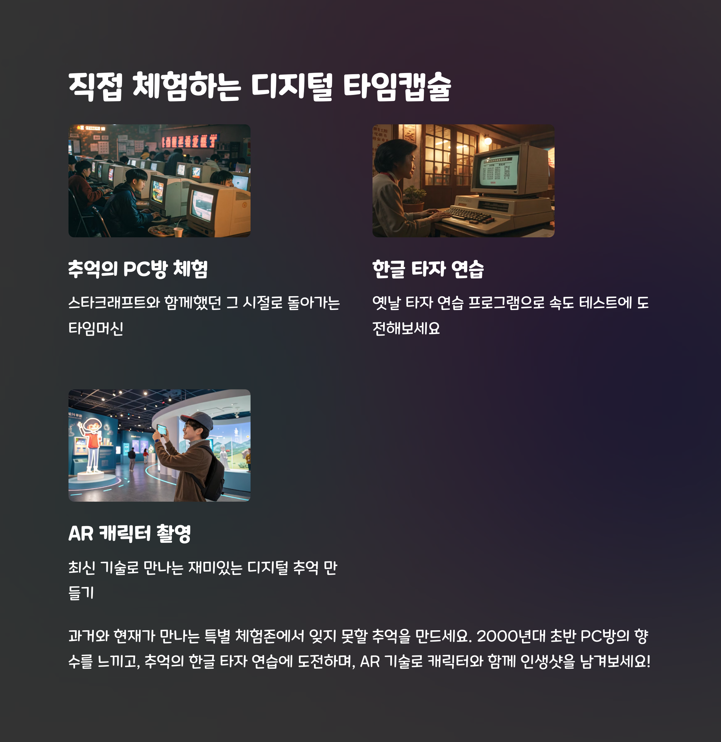 | 이번 전시에서는 다양한 체험 프로그램을 무료로 제공합니다. 대표적으로 스타크래프트 체험존이 있으며 초기 PC방 환경을 그대로 재현해 게임 플레이를 즐길 수 있습니다. 또 다른 프로그램인 한메타자 베네치아는 한글 타자를 익힐 수 있는 추억의 소프트웨어 체험입니다. 이외에도 전시공간 곳곳에서 진행되는 증강현실(AR) 캐릭터 촬영 체험이 준비되어 있습니다. 모든 프로그램은 별도의 사전 예약 없이도 자유롭게 참여할 수 있어 방문객들의 만족도가 높을 것으로 기대됩니다. |