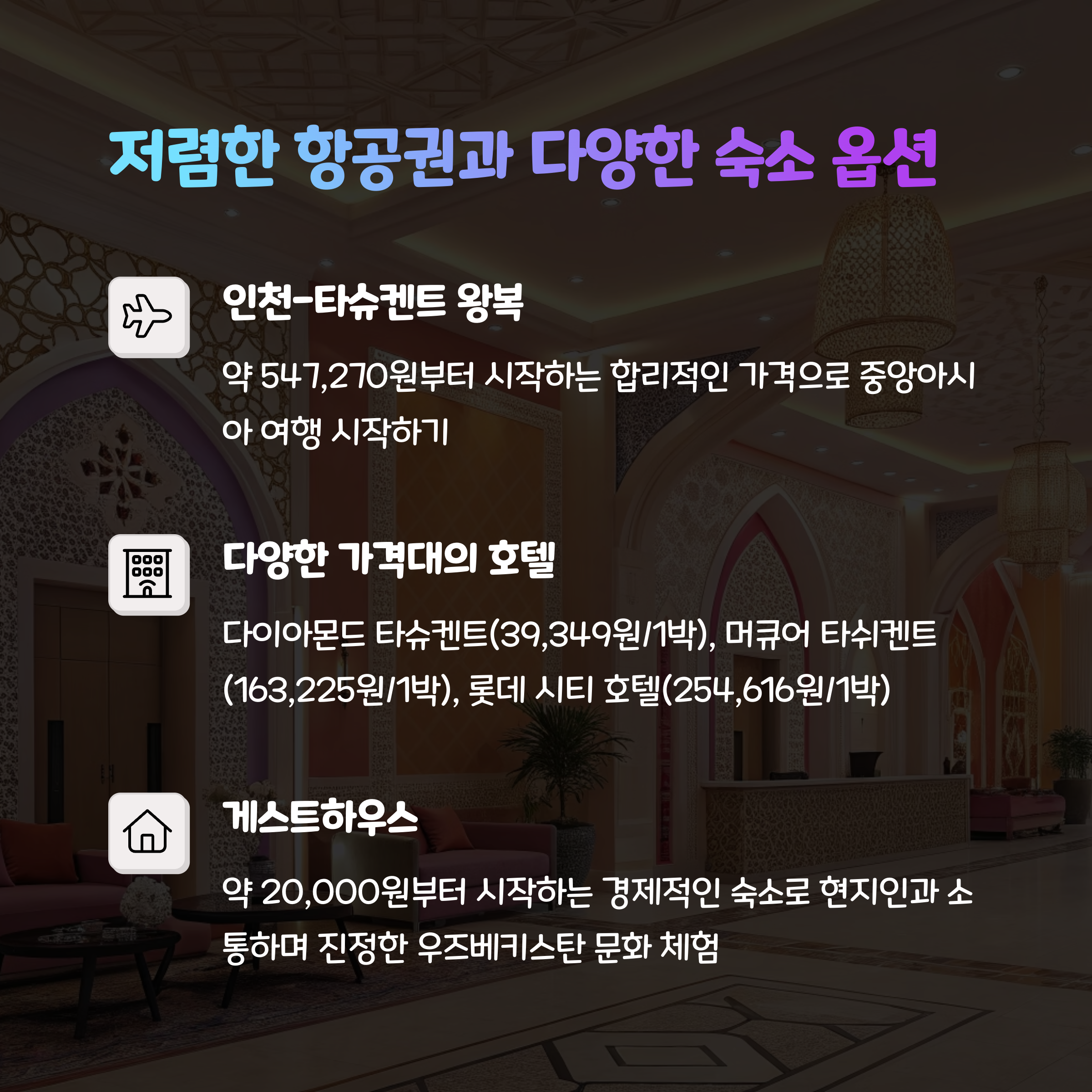 우즈베키스탄은 역사와 문화를 경험할 수 있는 독특한 여행지입니다.