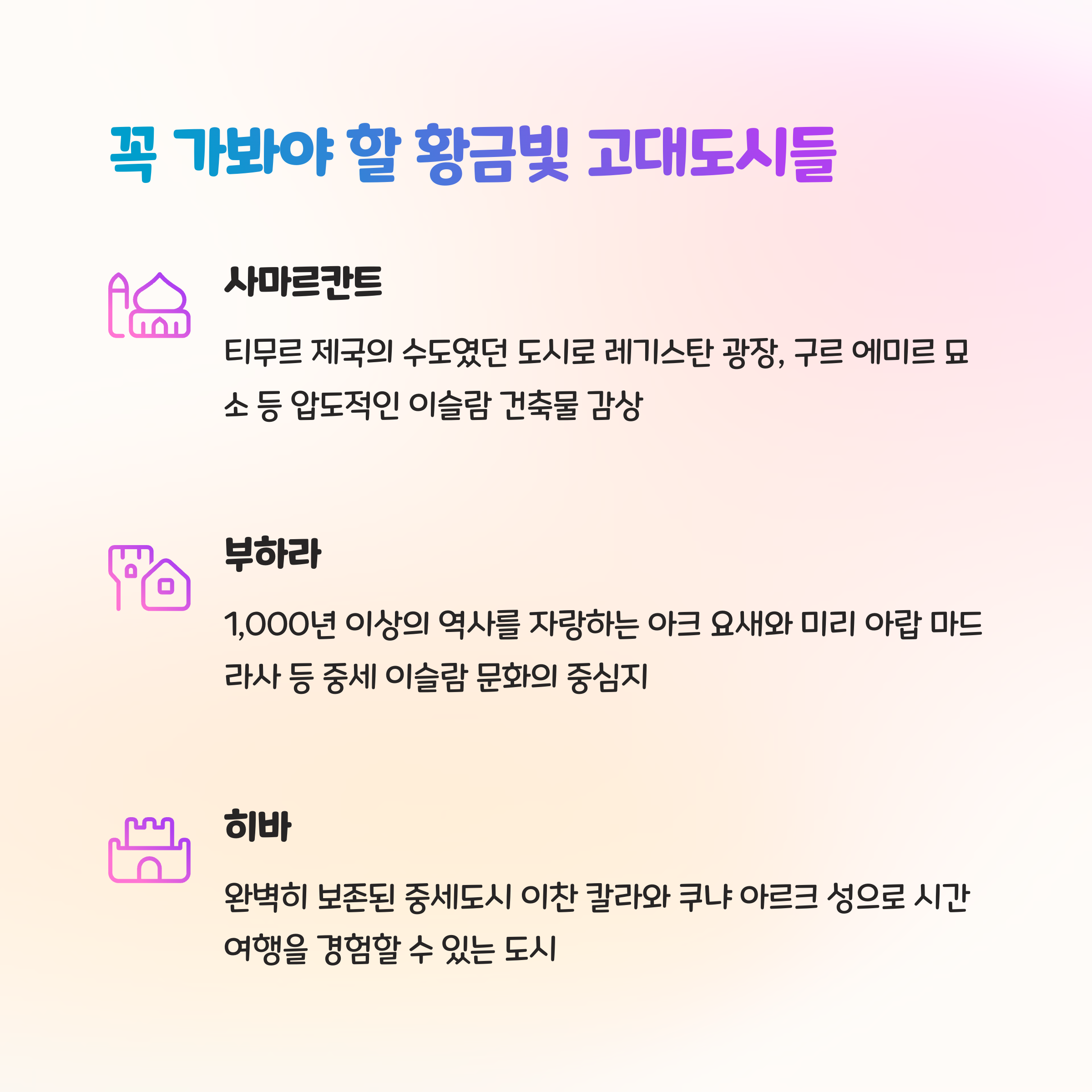 | 우즈베키스탄의 대표 도시는 사마르칸트, 부하라, 히바입니다. 사마르칸트는 레기스탄 광장과 같은 유적지로 매우 유명합니다. 부하라는 2,500년 역사의 건축물이 자리한 전통 도시입니다. 히바는 유네스코 세계문화유산으로 지정된 독특한 벽돌 도시입니다. 각각의 도시는 실크로드의 핵심으로서 독특한 매력을 제공합니다. |