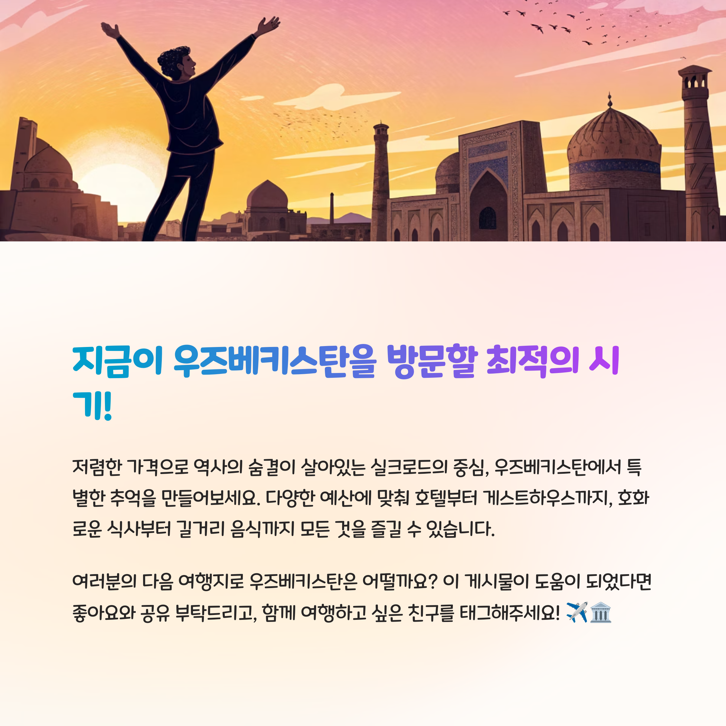 우즈베키스탄은 역사와 문화를 경험할 수 있는 독특한 여행지입니다.