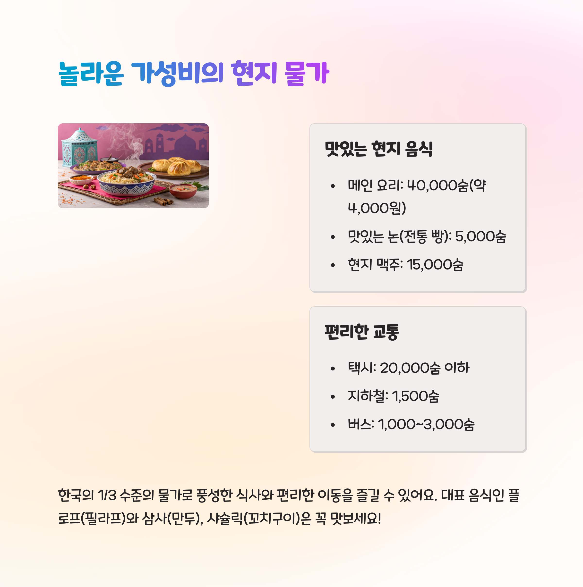 현지 물가는 한국과 비교해 상대적으로 매우 저렴하며, 식사나 대중교통 이용 비용도 부담이 작습니다.