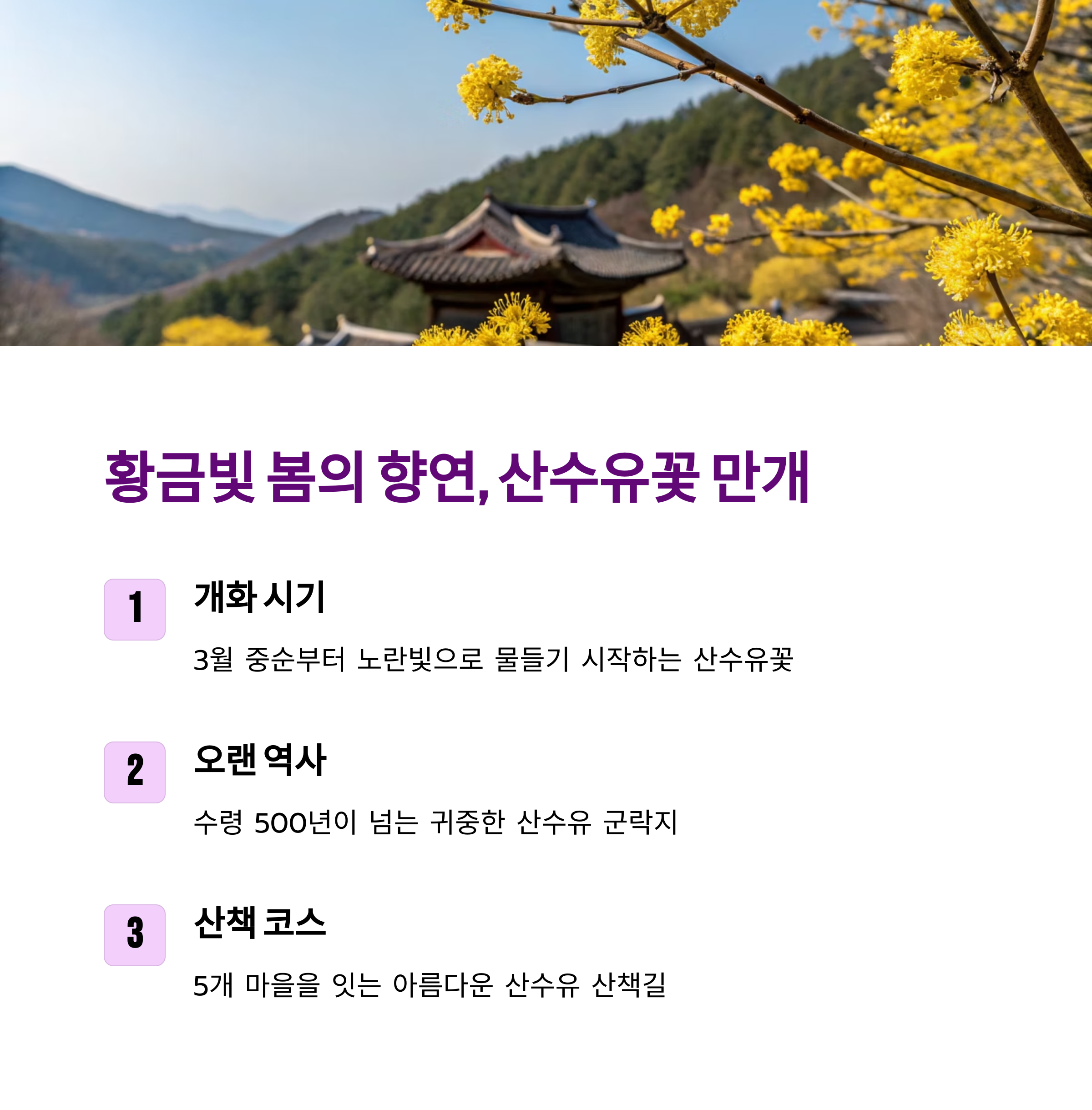 산수유꽃의 만개 시기에 맞춰 방문하면 더욱 환상적인 경치를 즐길 수 있습니다.