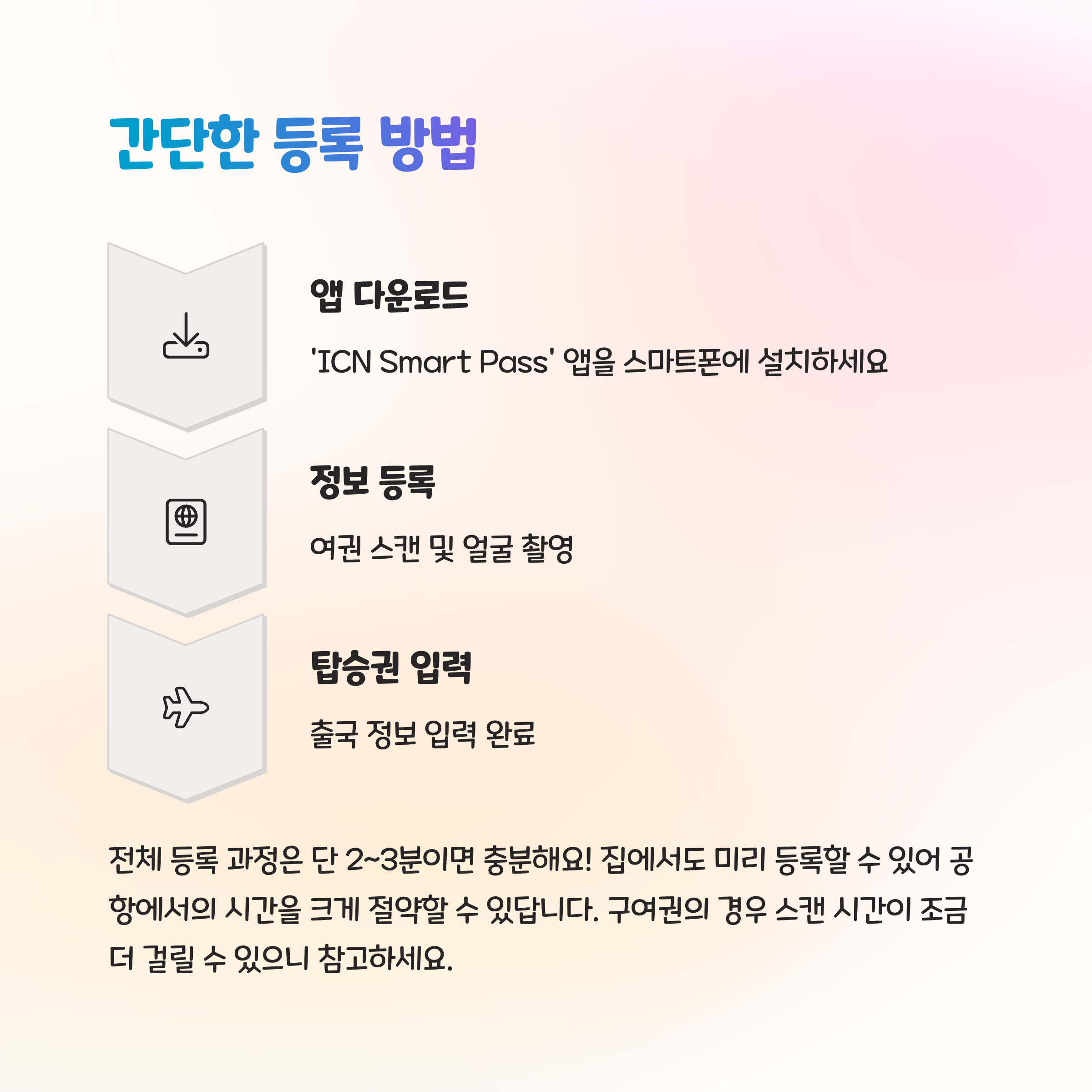 스마트패스 등록은 앱 다운로드와 데이터 입력으로 이루어지는 간단한 절차입니다.