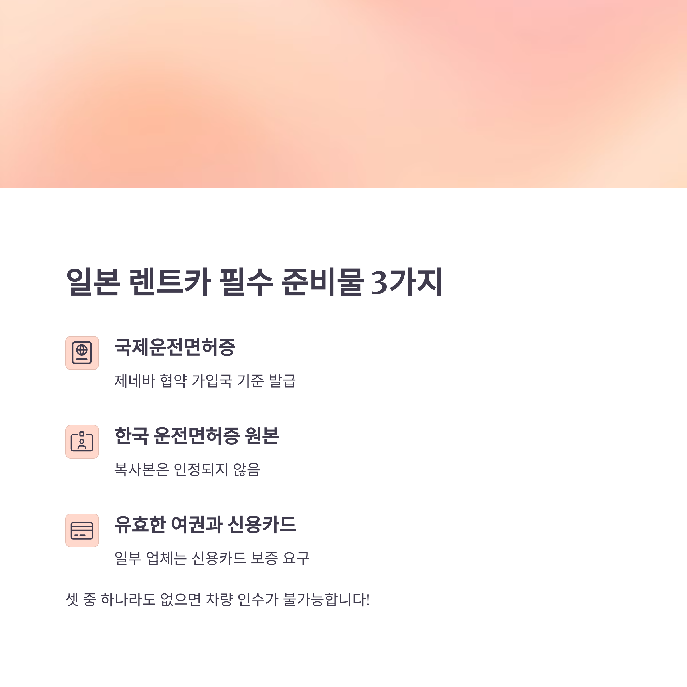 "셋 중 하나라도 없으면 차량 인수가 불가능하니, 출국 전 반드시 확인하세요."