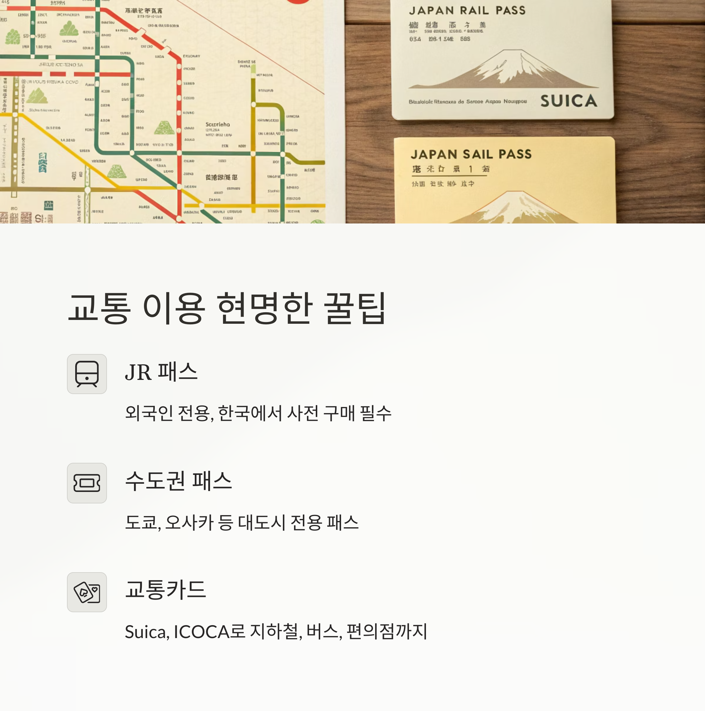- 일본 교통카드(Suica, ICOCA): 지하철, 버스, 편의점까지 한 번에
