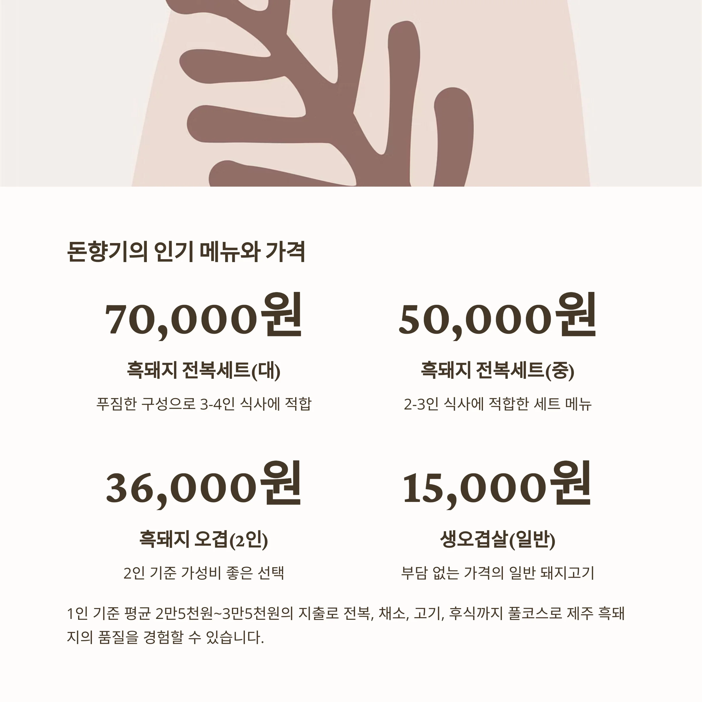 1인 기준 평균 2만5000원~3만5000원의 지출로 푸짐하게 식사할 수 있습니다.