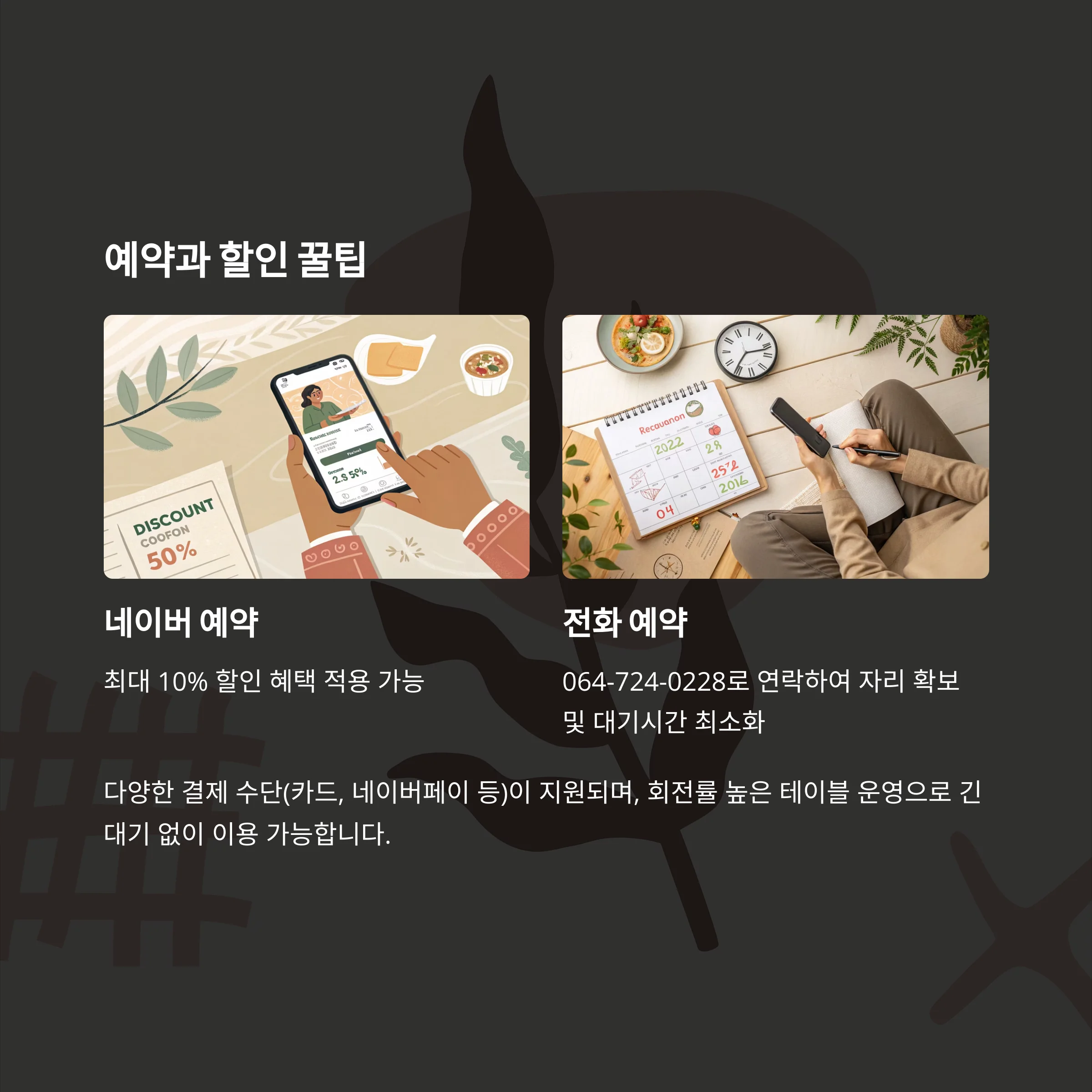 | 전화 예약(064-724-0228) | 자리 확보 및 대기시간 최소화 |
