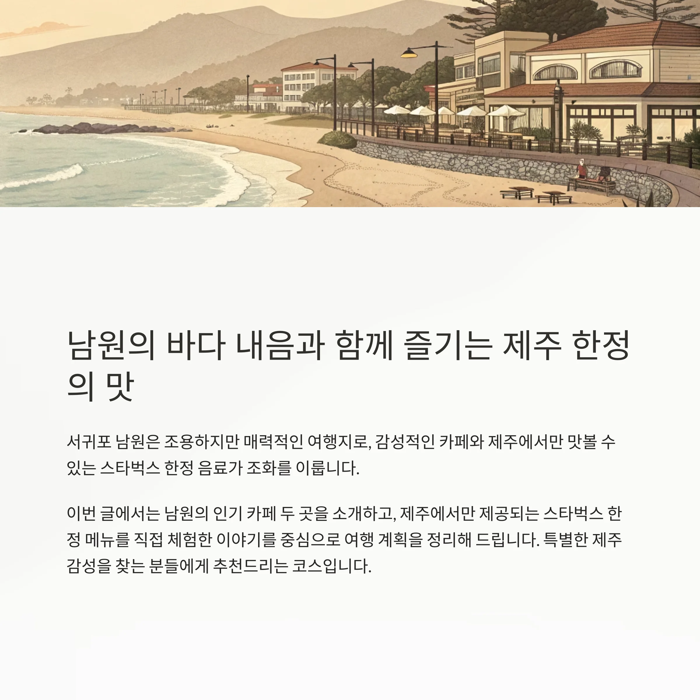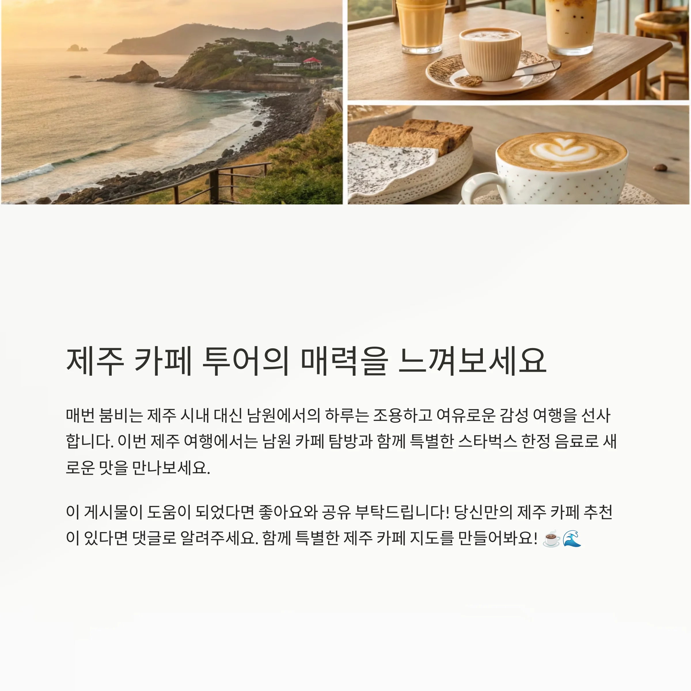 서귀포 남원은 조용하지만 매력적인 여행지로, 감성적인 카페와 제주에서만 맛볼 수 있는 스타벅스 한정 음료가 조화를 이룹니다. 이번 글에서는 남원의 인기 카페 두 곳을 소개하고, 제주에서만 제공되는 스타벅스 한정 메뉴를 직접 체험한 이야기를 중심으로 여행 계획을 정리해 드립니다. 특별한 제주 감성을 찾는 분들에게 추천드리는 코스입니다.