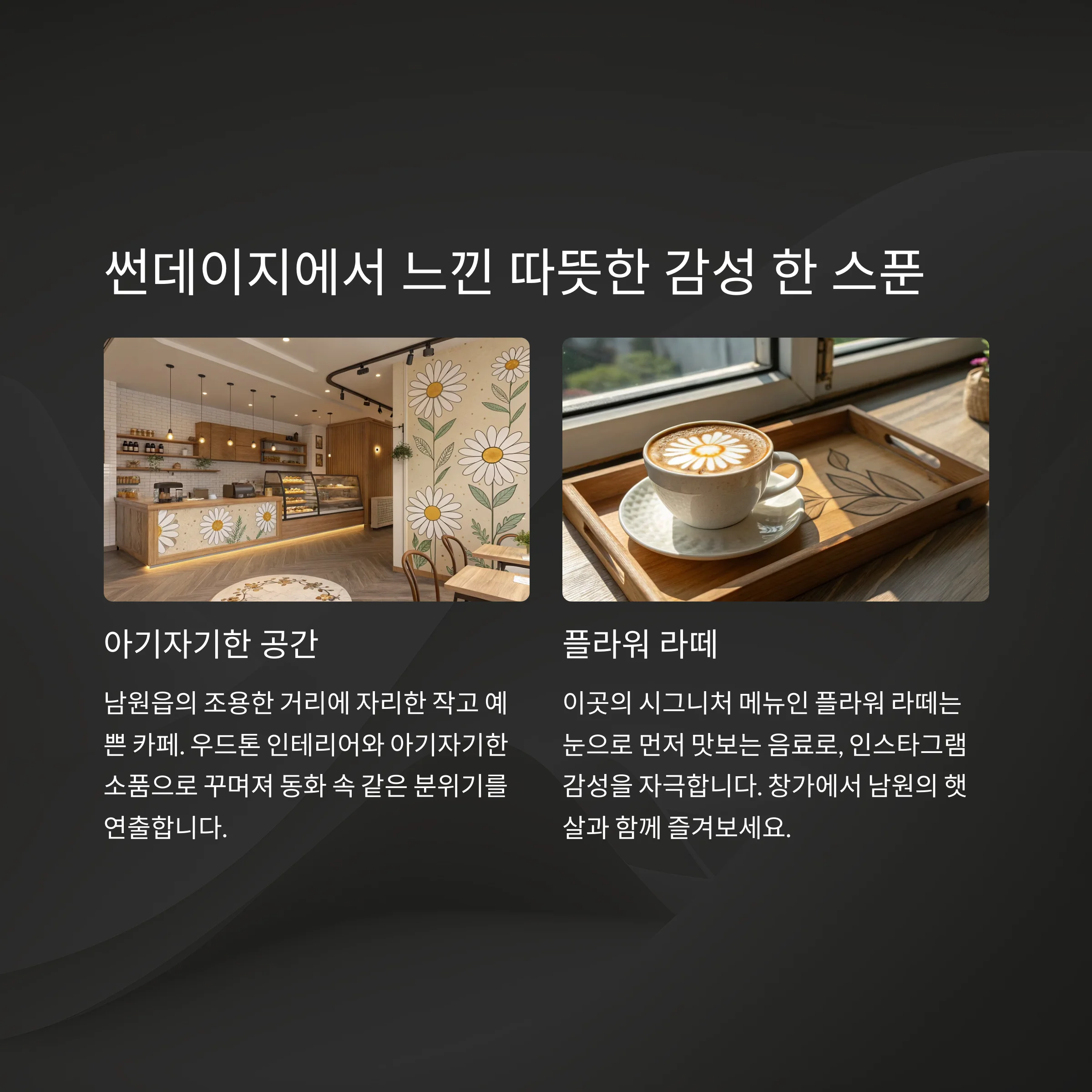 썬데이지는 남원읍의 조용한 거리에 자리한 작고 예쁜 카페입니다.