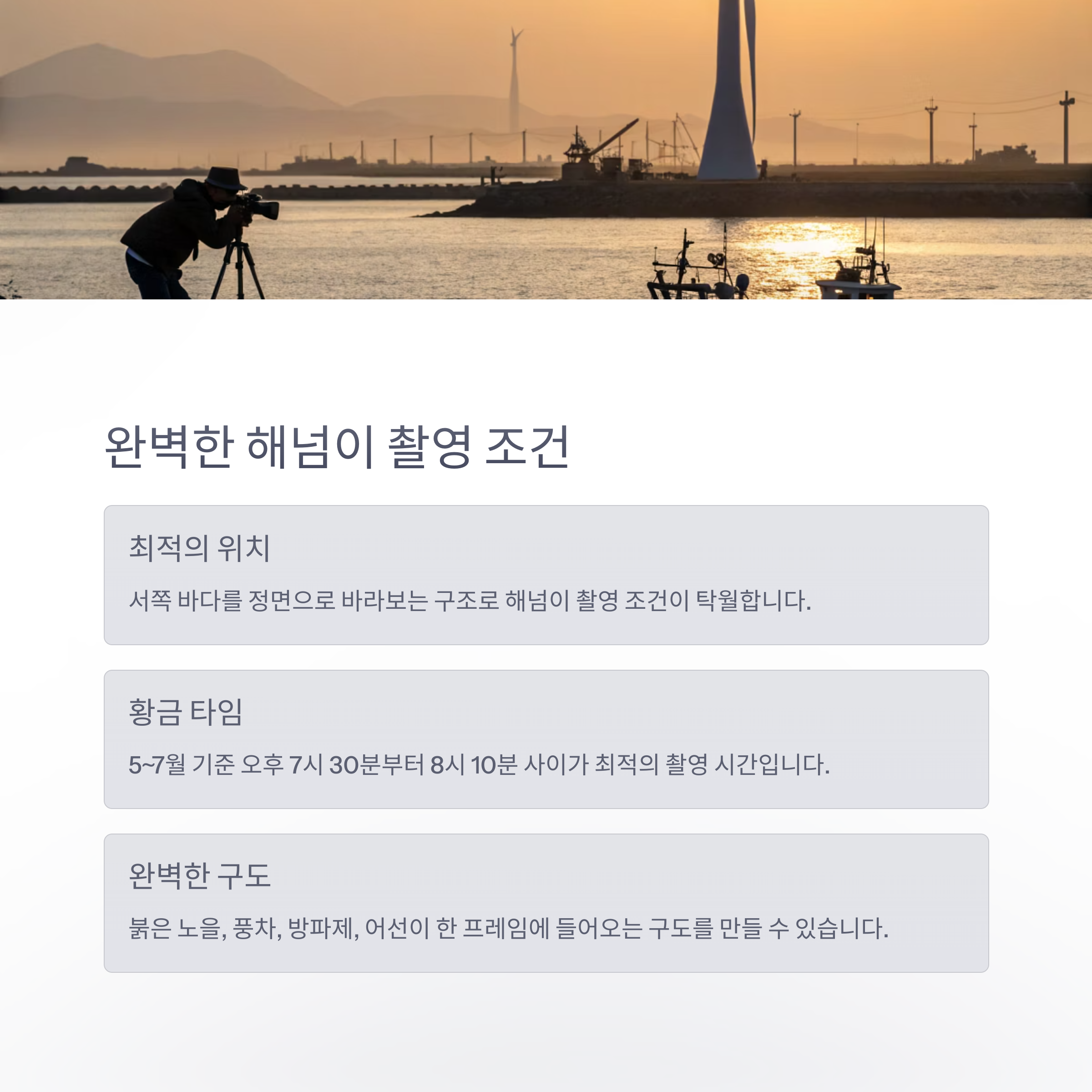 이 시간대 방문 시 붉은 노을, 풍차, 방파제, 어선이 한 프레임에 들어오는 구도를 만들 수 있습니다.