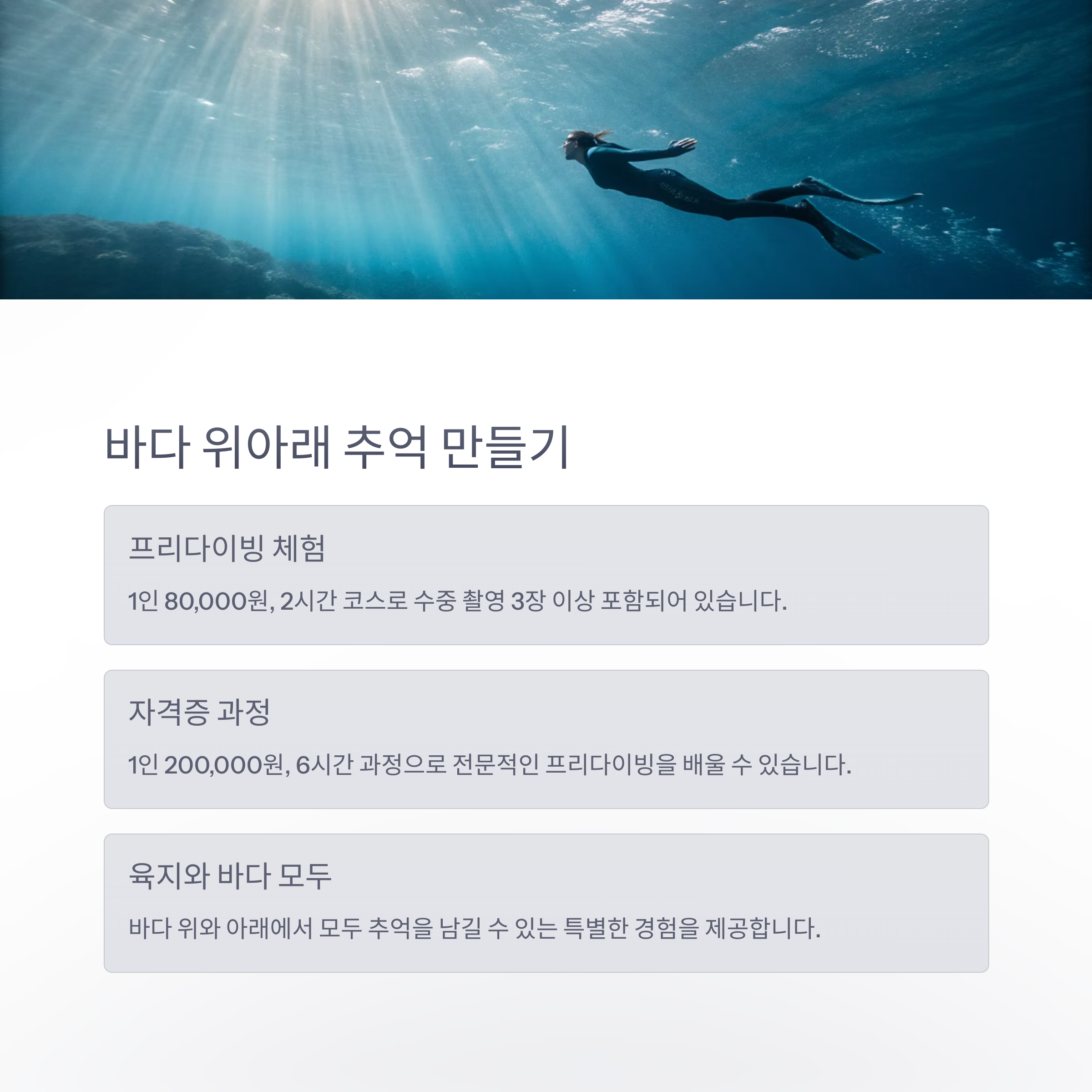 체험 프로그램 | 프리다이빙(80,000원~), 자격증 과정(200,000원~) |