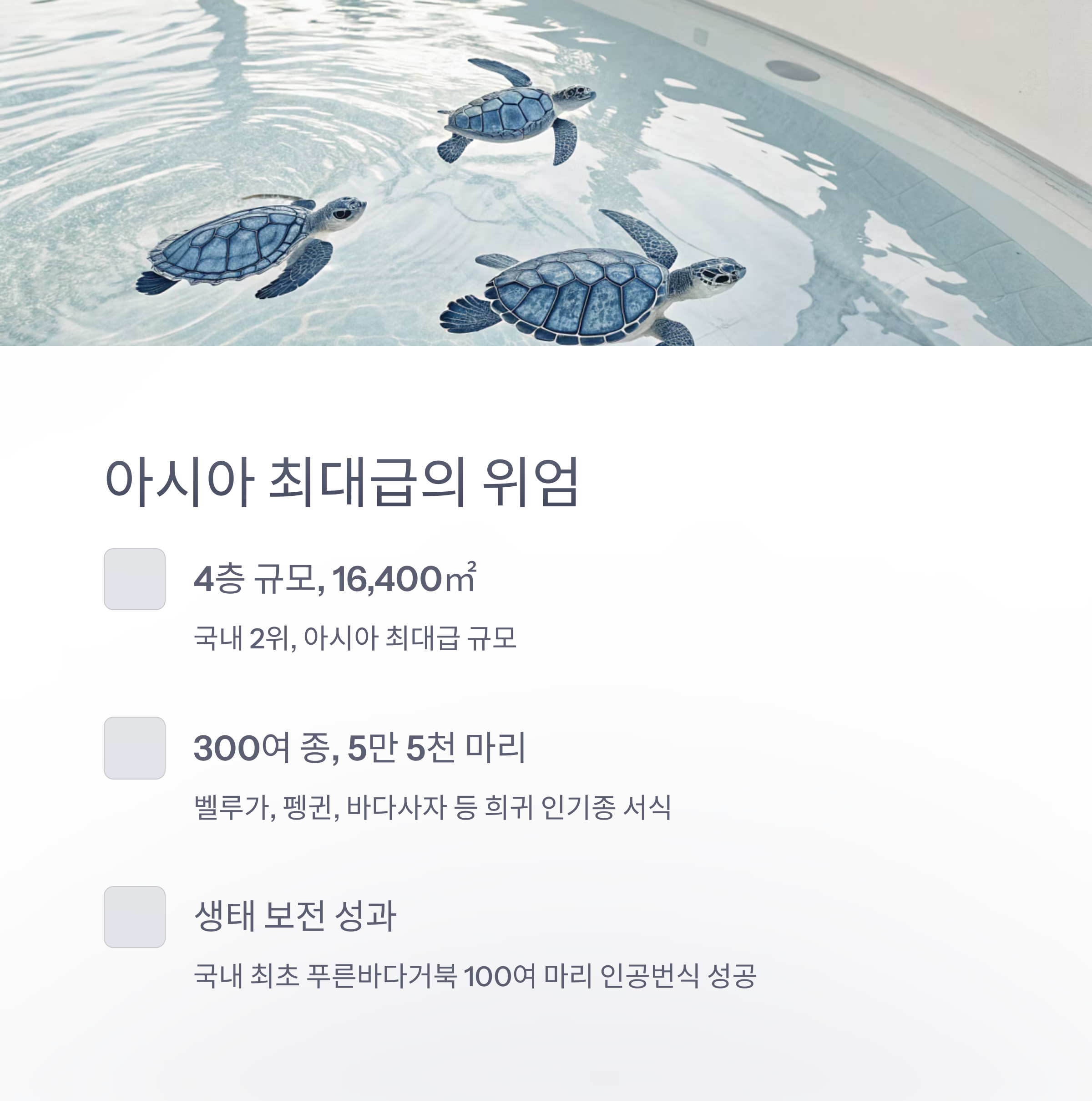 아래 표는 여수 아쿠아플라넷의 핵심 수치를 한눈에 보여줍니다.
