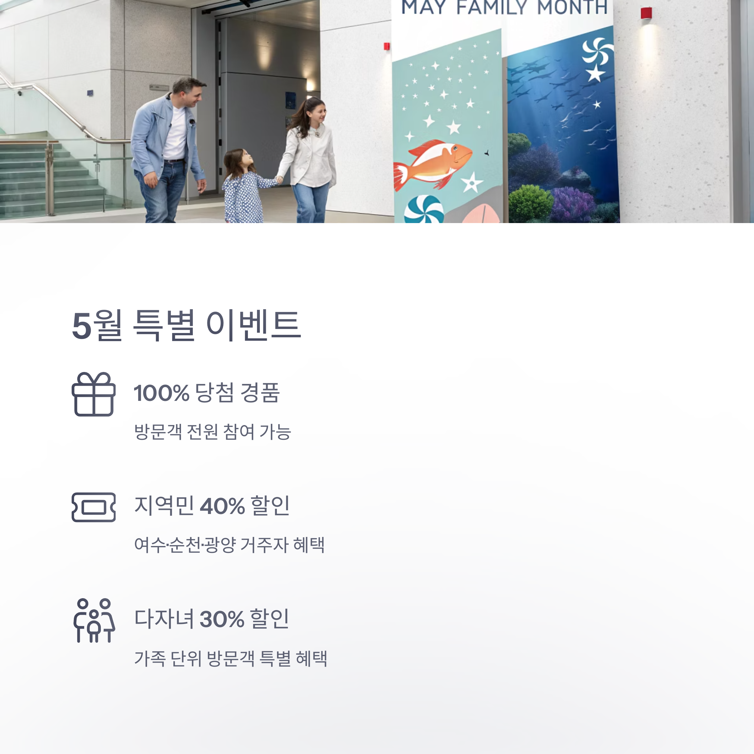 또한 여수·순천·광양 지역민은 현장 40% 할인, 다자녀는 30% 할인이 적용되어