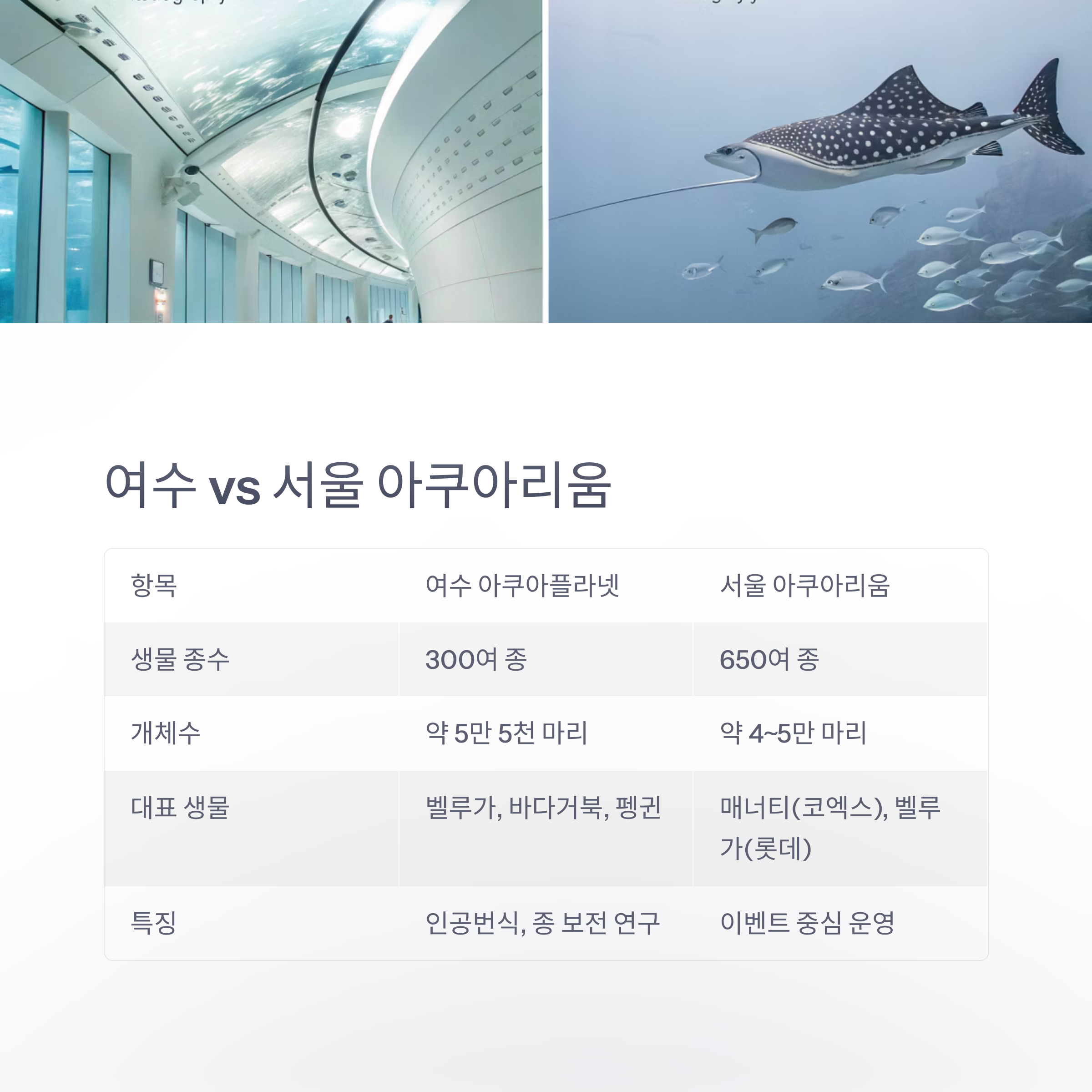 | 대표 생물 | 벨루가, 바다거북, 펭귄 등 | 매너티(코엑스), 벨루가(롯데월드) 등 |