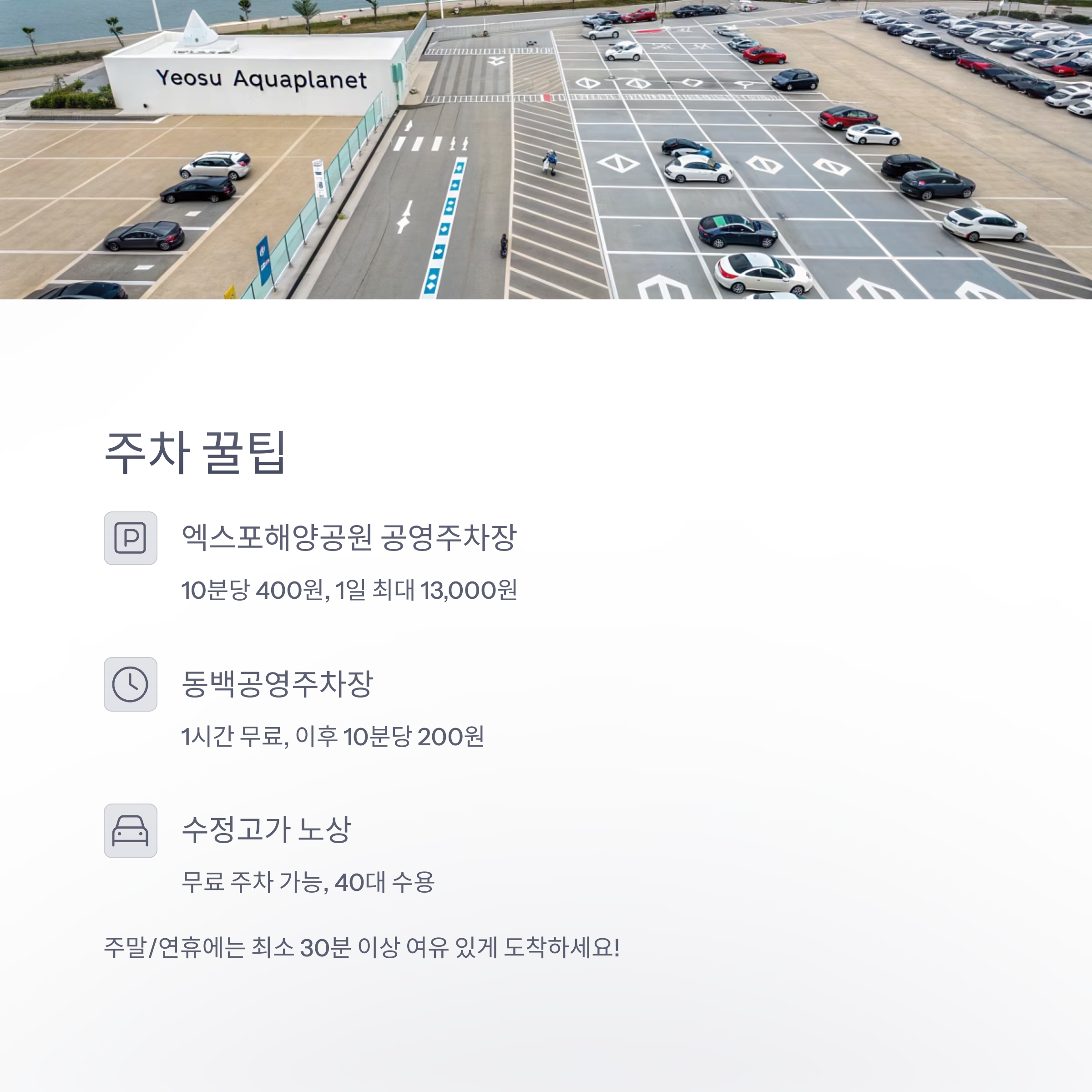 | 야외주차장 | 여수시 수정동 777-1 | 10분당 400원 / 1일 최대 13,000원 |