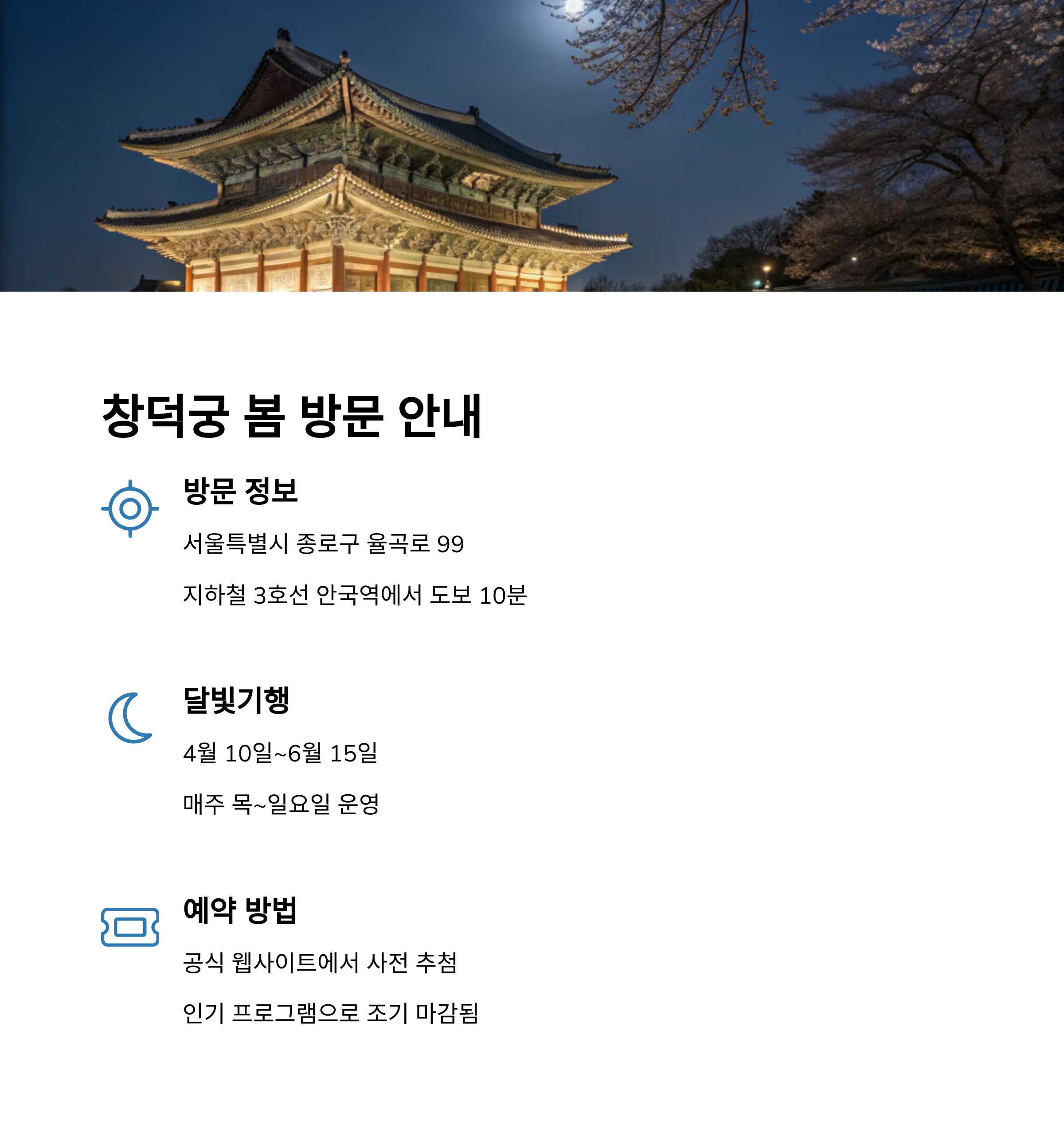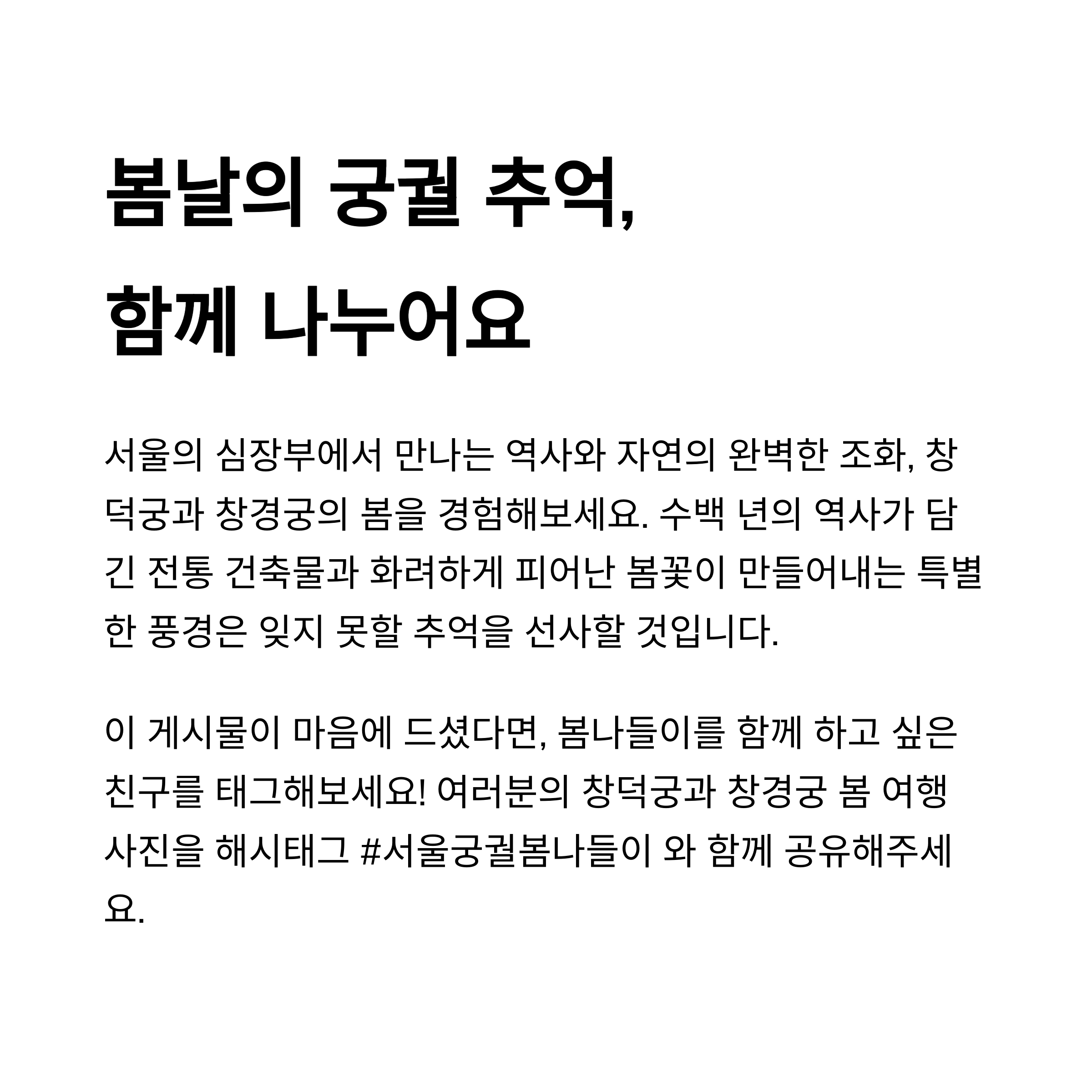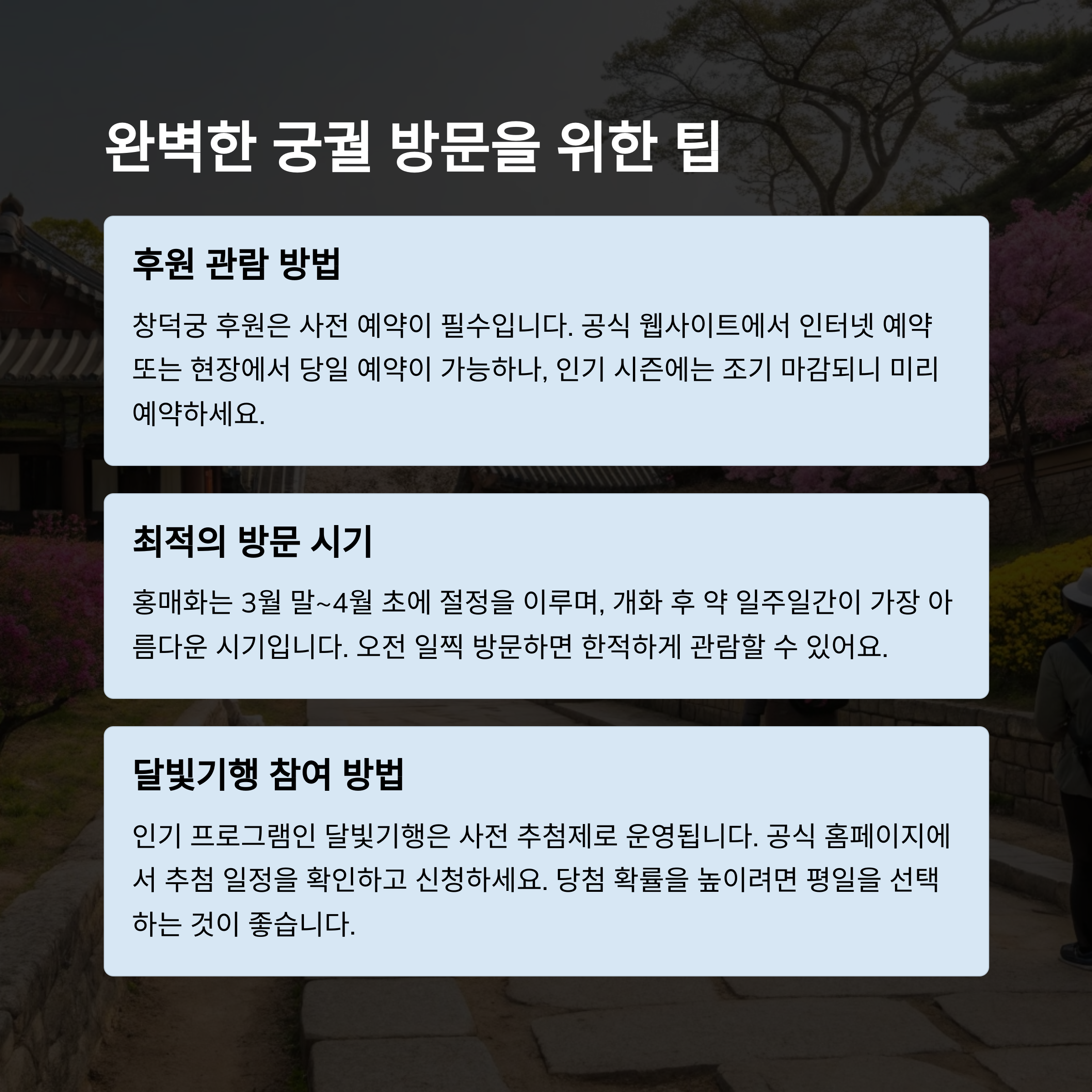 홍매화와 벚꽃이 만개한 이 시즌에는 두 궁궐 모두에서 자연스러운 풍경과 고즈넉한 멋을 즐길 수 있습니다.