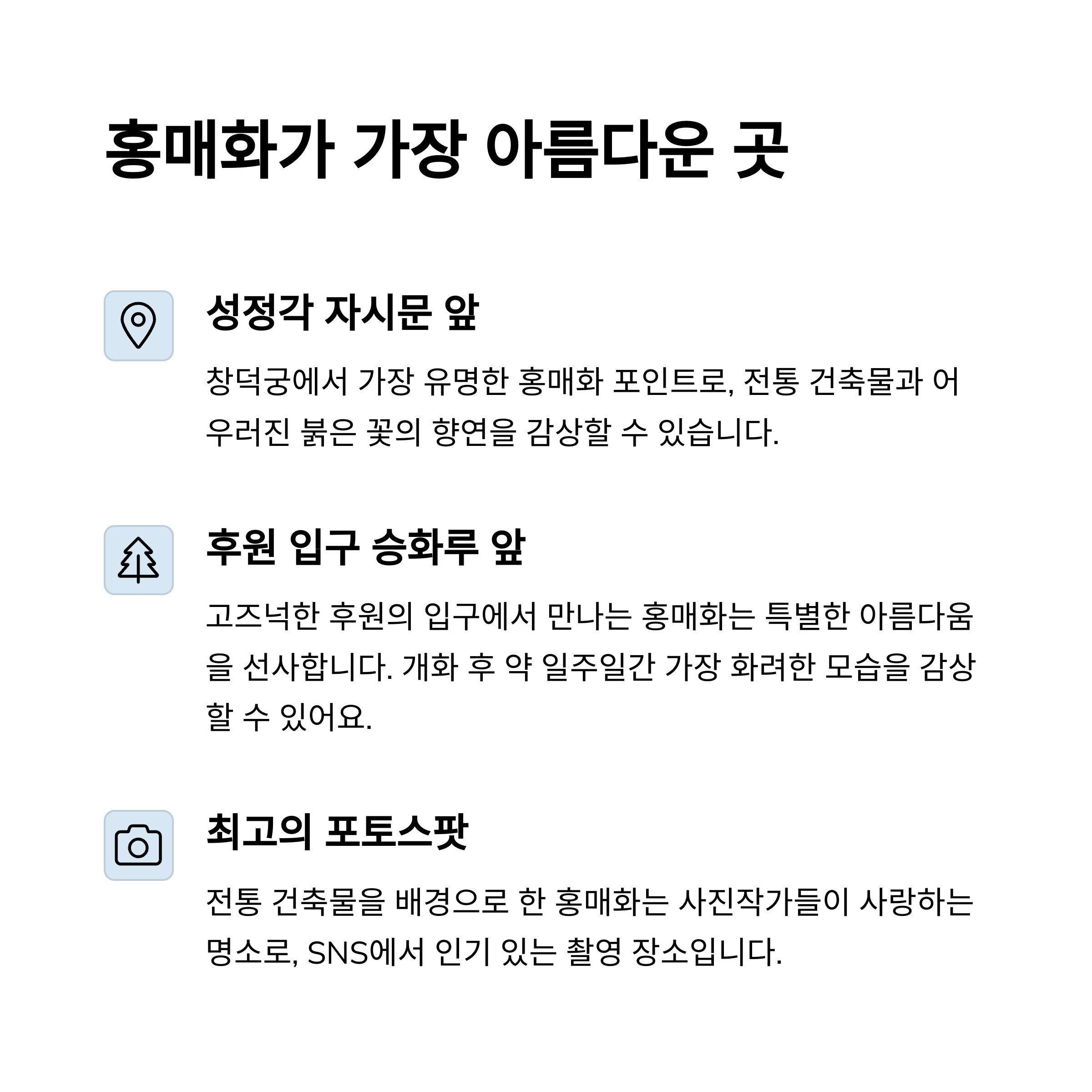 | 창덕궁 홍매화 예상 개화 시기 | 3월 말 ~ 4월 초 |
