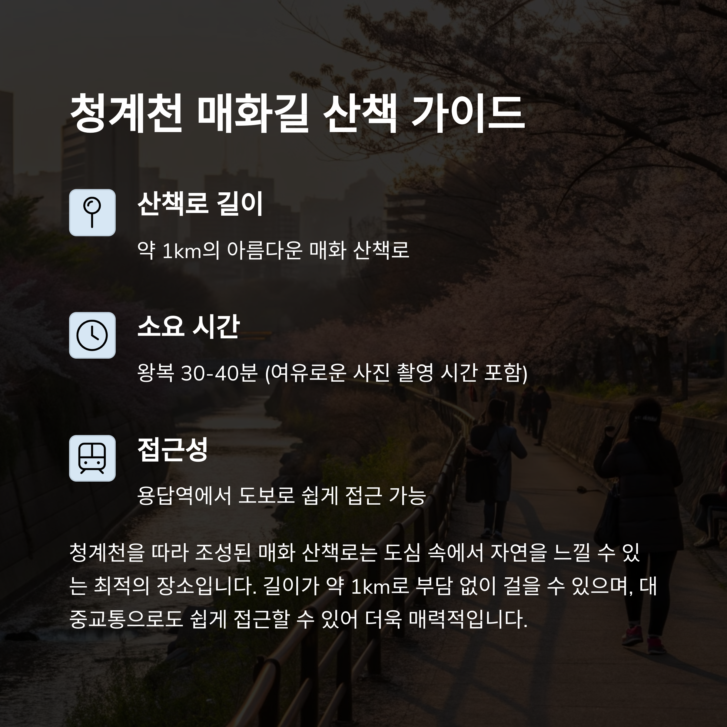청계천 용답매화마을은 봄을 특별하게 느낄 수 있는 서울의 대표 산책 명소입니다.