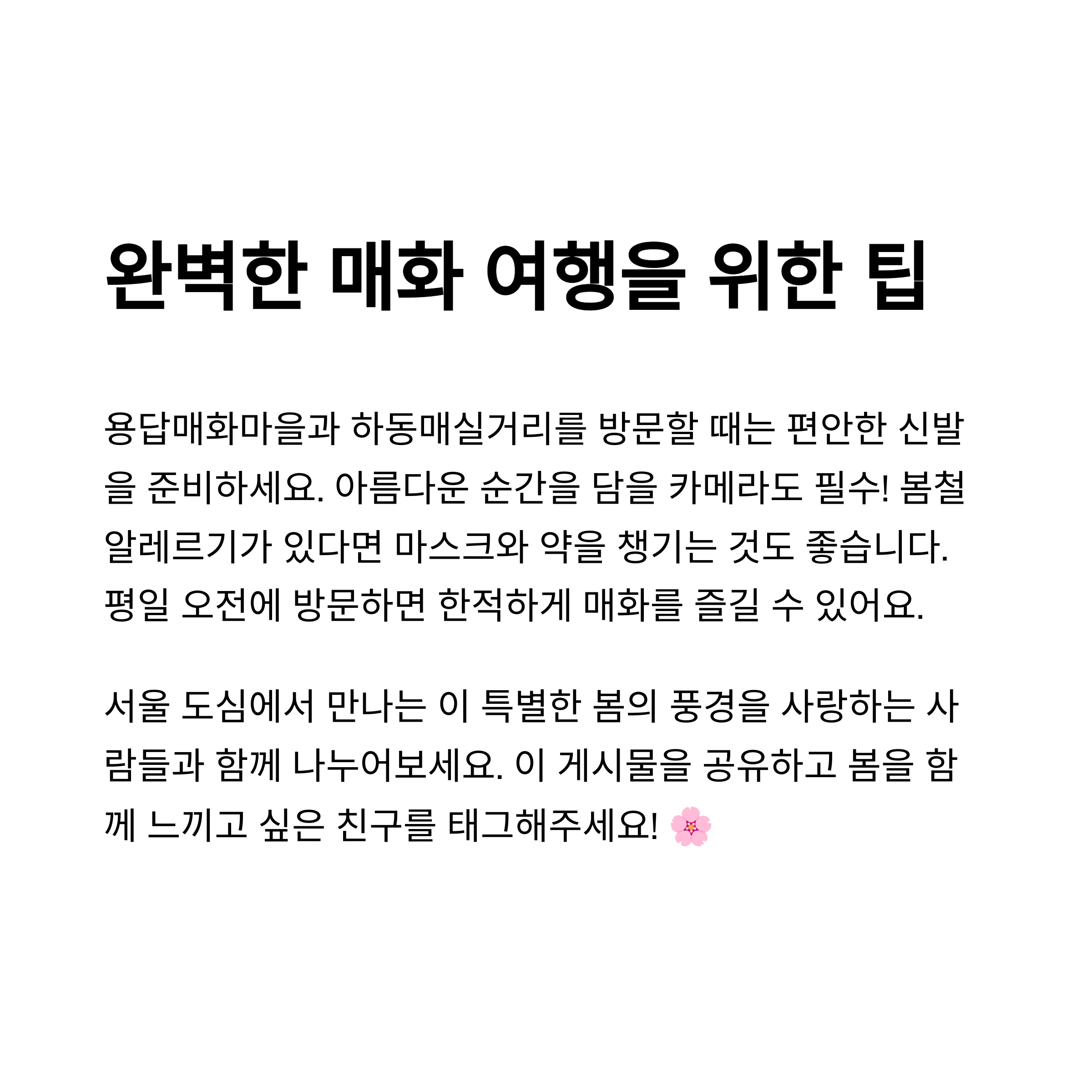 | 초봄에는 날씨가 변덕스러워 옷차림에 주의해야 합니다. 청계천 산책로는 노출 공간이 많아 바람이 강해질 수 있습니다. 하동매실거리는 인기가 높은 장소라 주차 공간이 부족할 수 있으니 대중교통을 추천합니다. 매화가 완전히 개화하는 시기에 방문하면 가장 좋은 사진 촬영 조건을 누릴 수 있습니다. 주말에는 방문객이 많아 조용한 관람을 원한다면 평일 오전 시간이 적합합니다. |