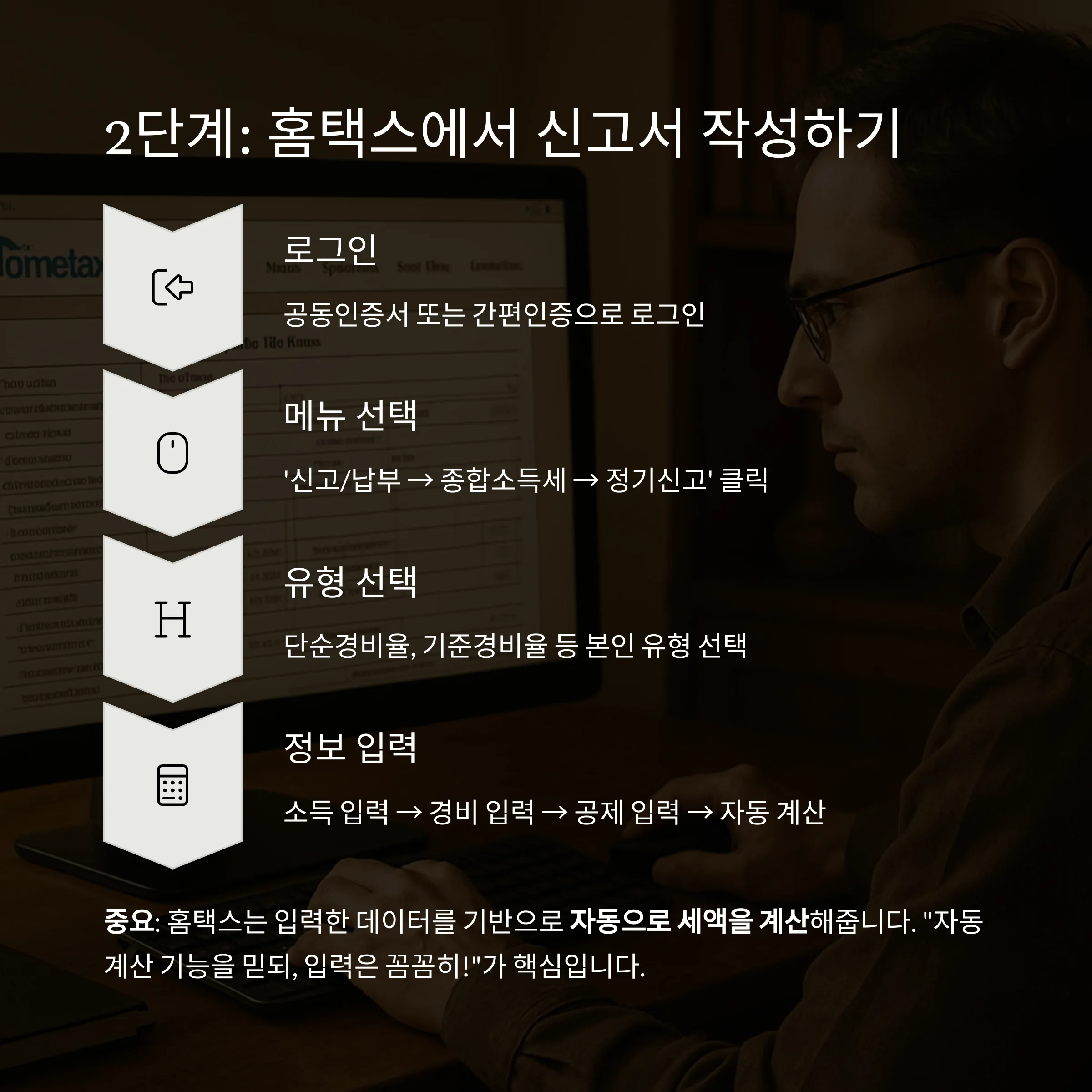 | 2단계 작성 | 홈택스 접속 후 신고서 작성 | 자동 계산, 공제 입력 정확히 |